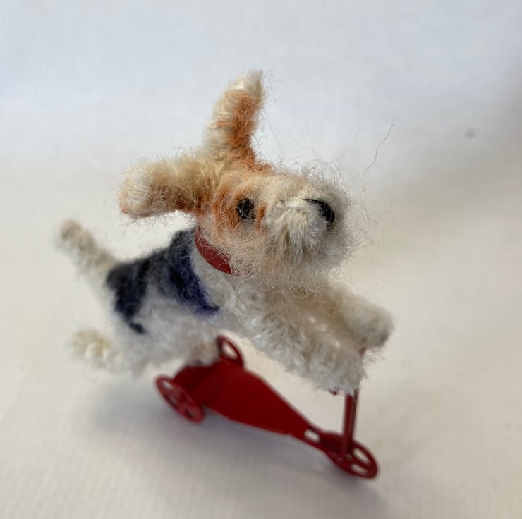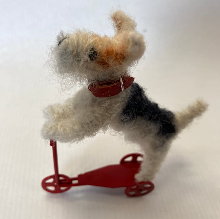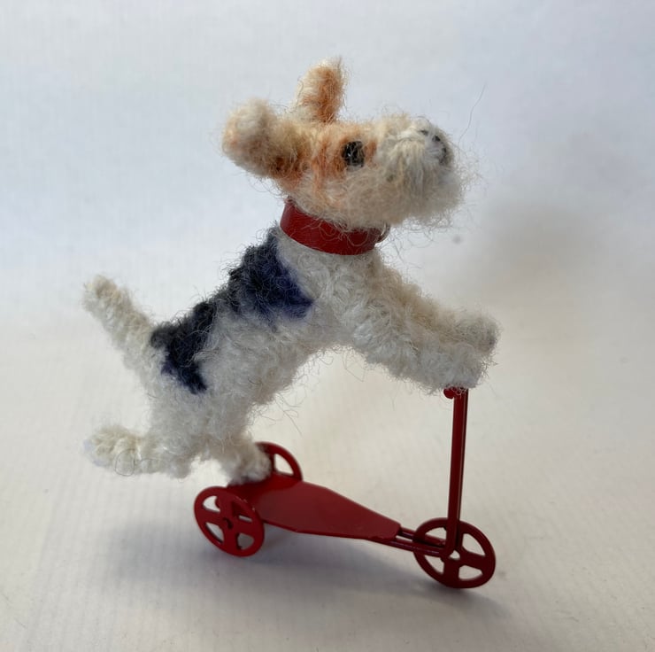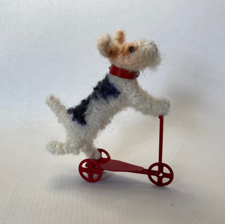 OOAK sculptured mini fox terrier on a tiny red metal scooter. Fluff measures 8cm x 6.5. She has a red leather collar.