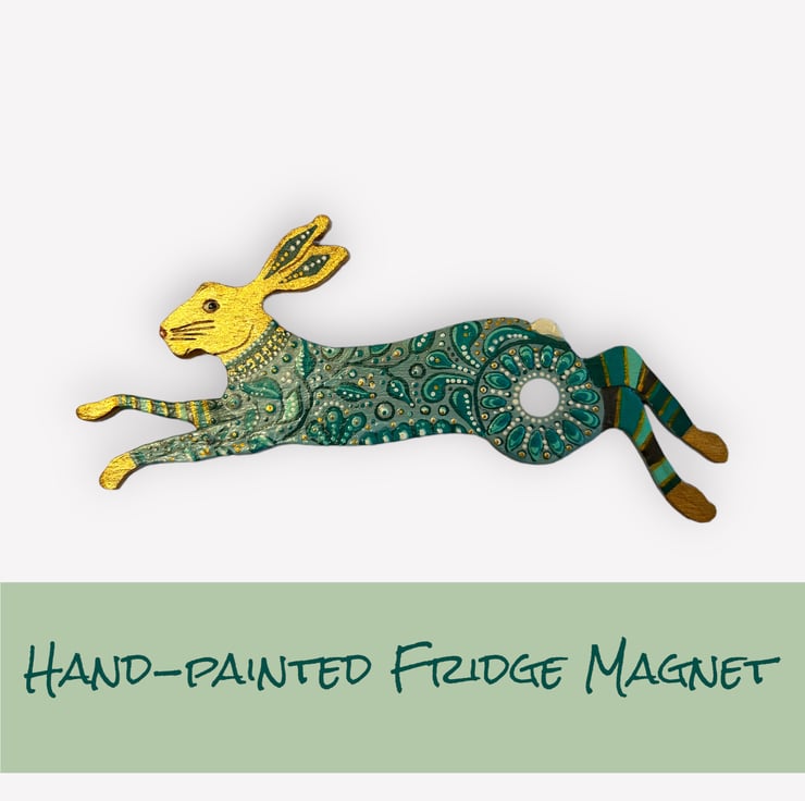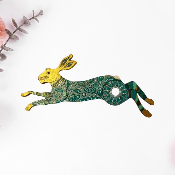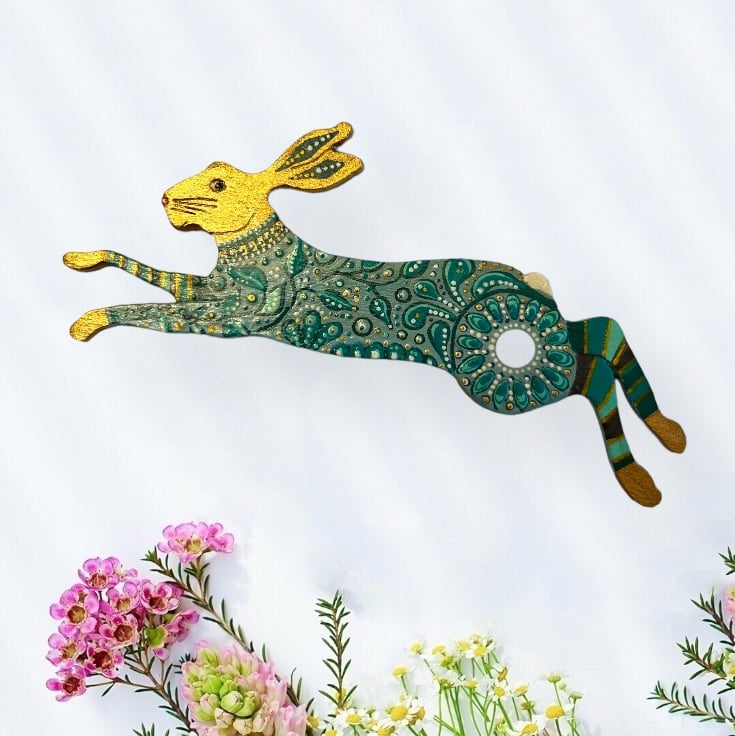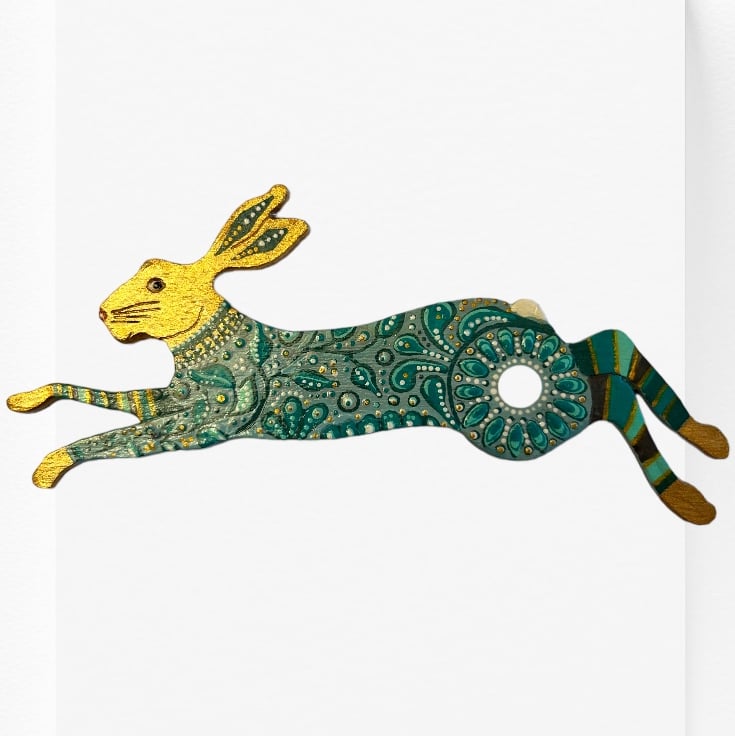 A gorgeous Running Hare with an intricate hand-painted design in gold, turquoise pearl and teal. 5" x 2" (12x5cm). Laser cut from 3mm Birch plywood and hand-painted in acrylics by me, finished with a high gloss varnish - the only one of it’s kind :)