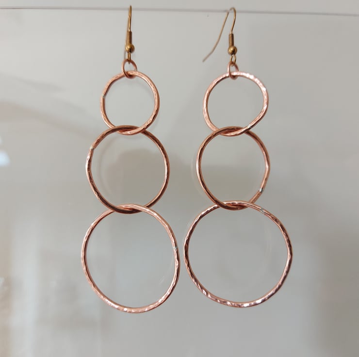 I have just sold the last pair of 3-hoop earrings that I had in stock and decided to make the next ones much larger. Are you bold enough to wear them? They are real statement earrings that look terrific on - especially if you have a long neck and like to wear your hair up sometimes! These dangly copper earrings are made from 1.5mm copper wire, hammered first then formed into rings with diameters of 2.0cm, 2.8cm and 3.6cm. The rings are linked in order of increasing size to form chains of three and soldered with silver solder. The top links are attached via jump rings to bronze-coloured ear hooks. The total drop from the bottom of the hook is 8cm. The rings are very mobile, catching the light as they twist and turn. They are comfortable to wear. I have given them a light polish with Renaissance wax which is used in museums to protect metal surfaces and reduce oxidation, so they should only need an occasional rub with a soft cloth to preserve their shine. These earrings will be packaged securely in a gift box and sent to you by Royal Mail first class post.