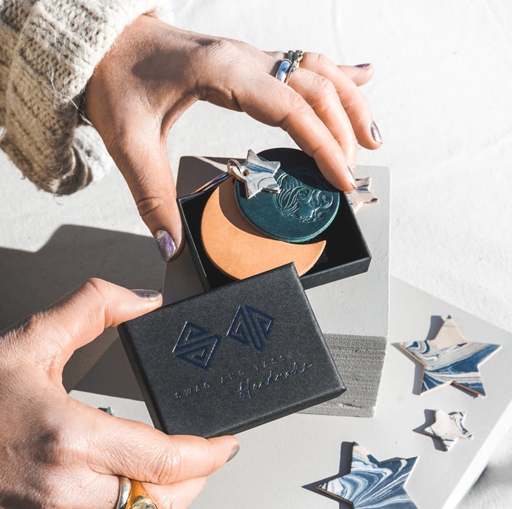 Made in our small studio in Pembrokeshire, West Wales. Each key ring is hand burnished and each star is hand marbled and unique.