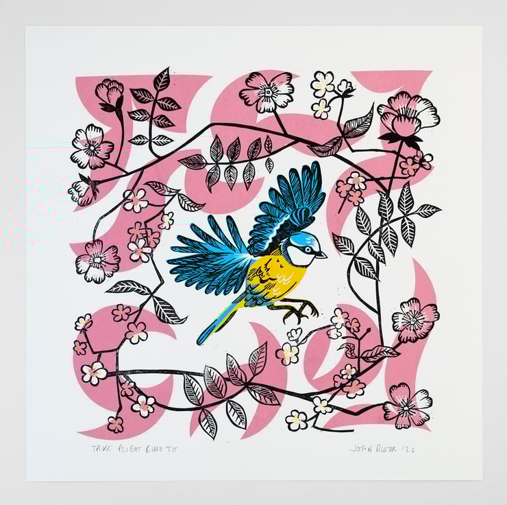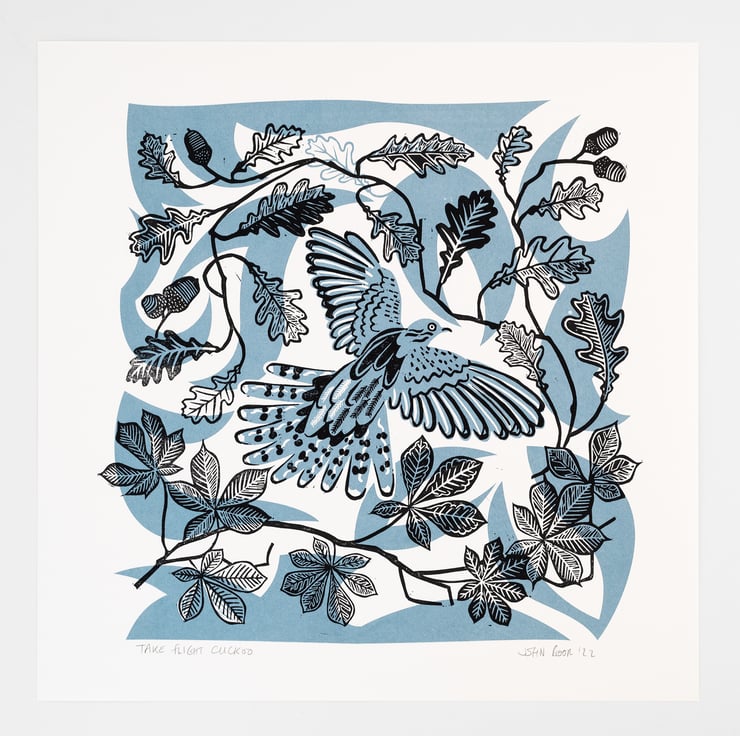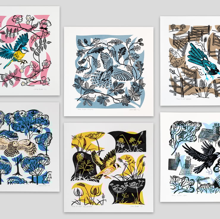 This set includes one each of the Blue Tit, Crow, Magpie, Cuckoo, Tawny Owl and Goldfinch linocut and screen prints which are part of a new series called "Take Flight". Each one is named and signed by me. The colours are hand screen printed and the black is hand cut and lino printed.