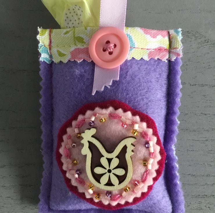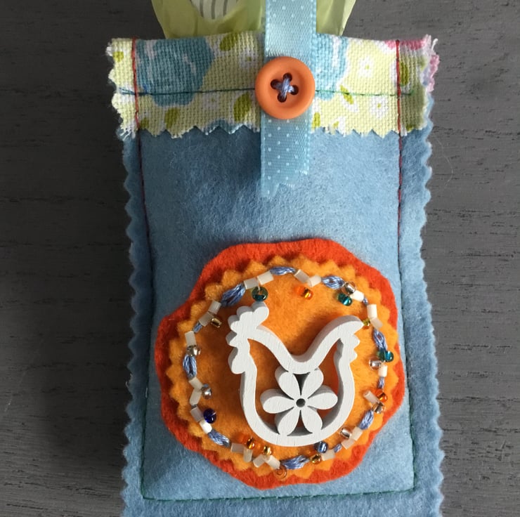 These Two Hand Embroidered Easter Chicken Treat Bags are made of felt with a wooden Chicken motif stitched onto circles of felt. Hand embroidered Lazy Daisy and Running Stitches with seed and glass beads surround this Easter motif. These embroideries are on treat bags, lined with floral material. A long ribbon hanging loop, secured with a button is at the top. To hang on an Easter tree or Spring branch…..or to give as an Easter gift to a friend or relative.