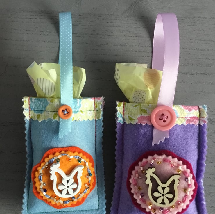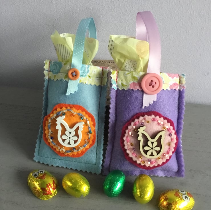 Each bag is 4 inches by 3 inches (8 by 10.50 cms). These Two Easter Treat Bags are ready to be filled with small Easter eggs as an Easter treat and gift. They are reusable bags and can be used each year.