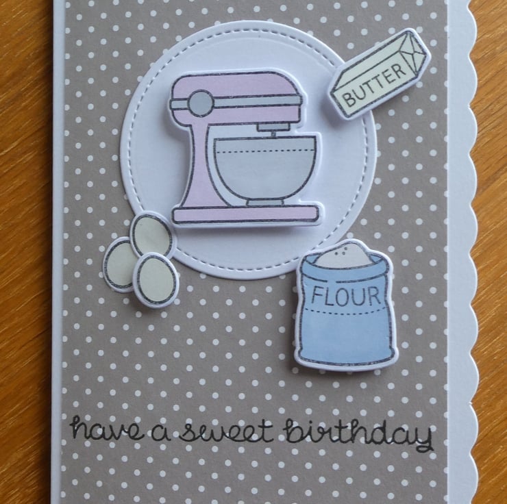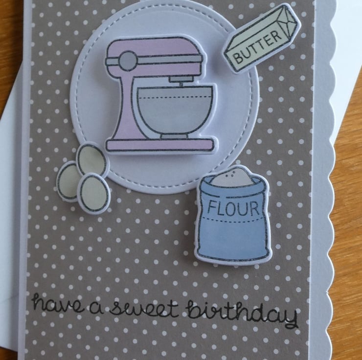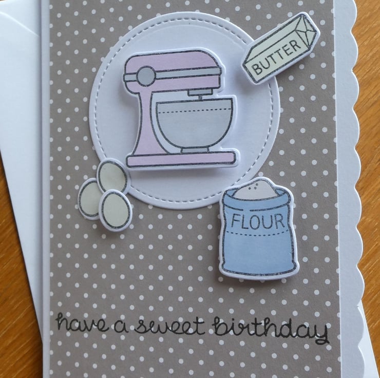 The card has an open bag of flour next to a stand mixer with a packet of butter and 3 eggs ready to bake. The hand stamped greeting 'Have a sweet birthday' completes the design.