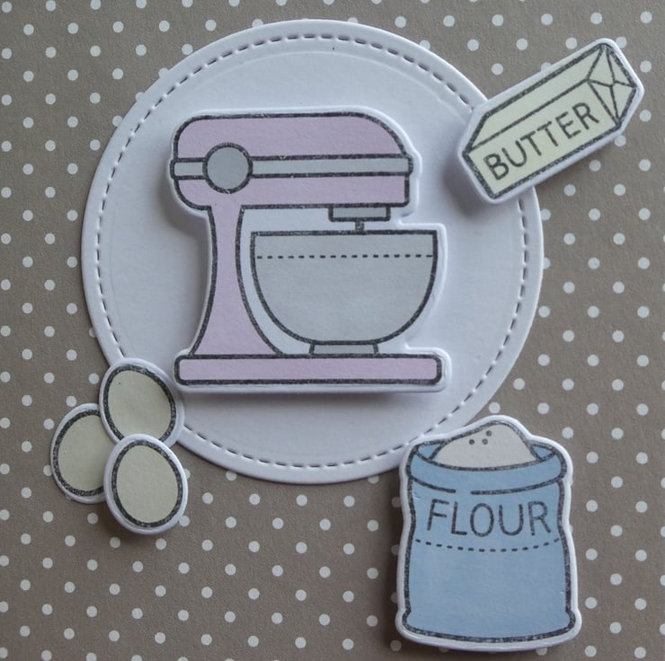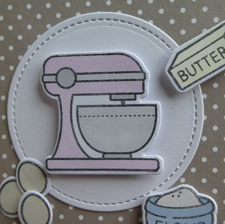 A base of brown and white polka dot card has been topped with a die cut circle of white card, with a stitched effect edging and several hand coloured baking accessories have then been attached. Some raised on foam pads to add dimension.