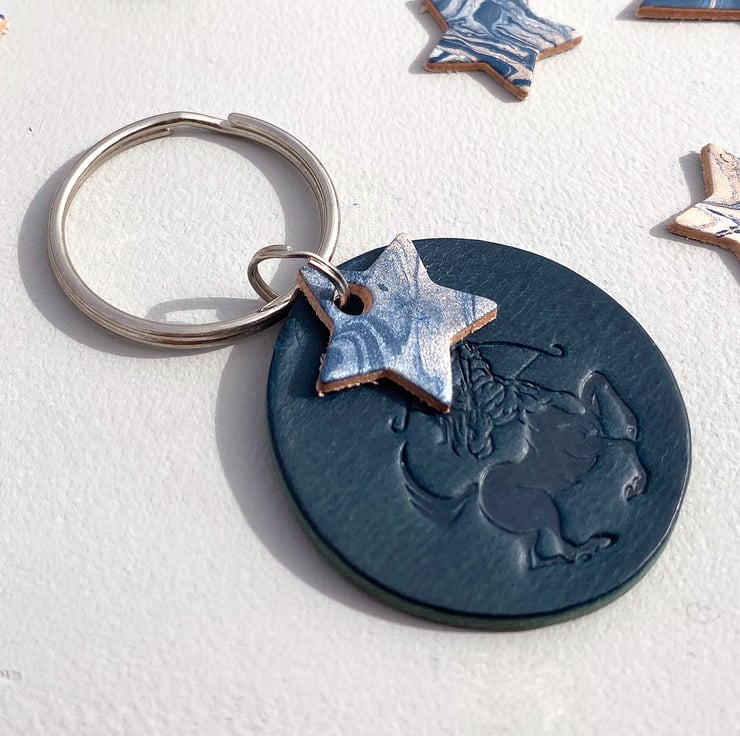 A beautiful leather keyring with a sagittarius Star Sign beautifully stamped in Italian veg tanned leather. Handmade to order.