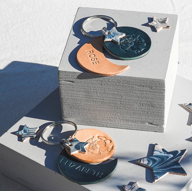 Made in our small studio in Pembrokeshire, West Wales. Each key ring is hand burnished and each star is hand marbled and unique.
