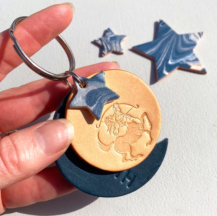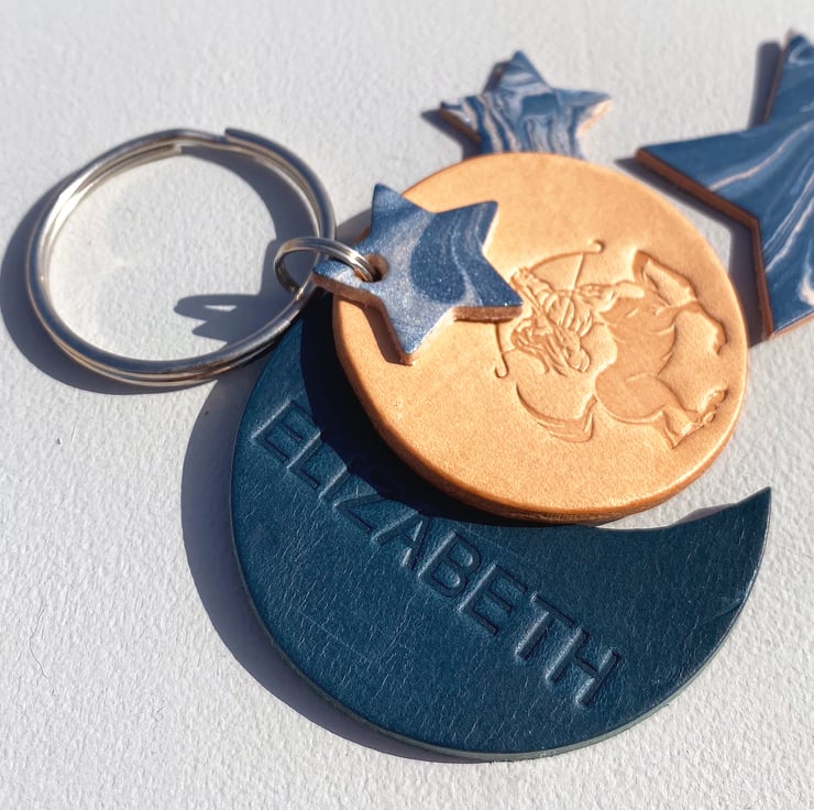 A beautiful personalised leather keyring with a Gemini Star Sign beautifully stamped in Italian veg tanned leather. Handmade to order.