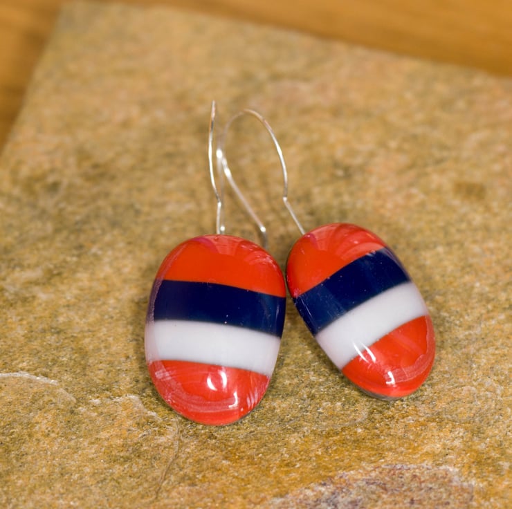 I made these earrings alongside other Red, White & Blue pieces to celebrate the coronation of King Charles III. Each cabochon is made by laying coloured glass ribbons on a shaped glass base.