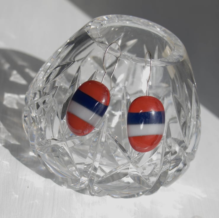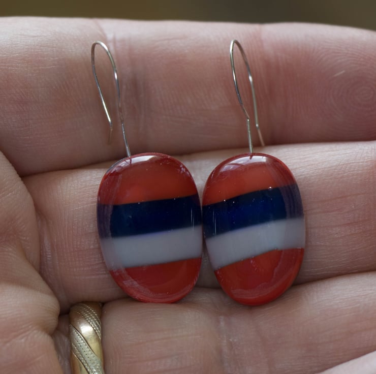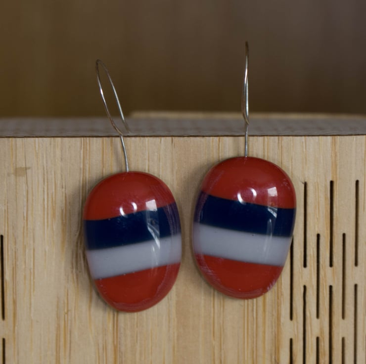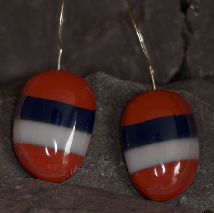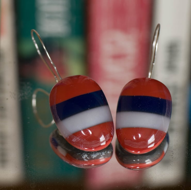 I made these earrings alongside other Red, White & Blue pieces to celebrate the coronation of King Charles III. Each cabochon is made by laying coloured glass ribbons on a shaped glass base.
