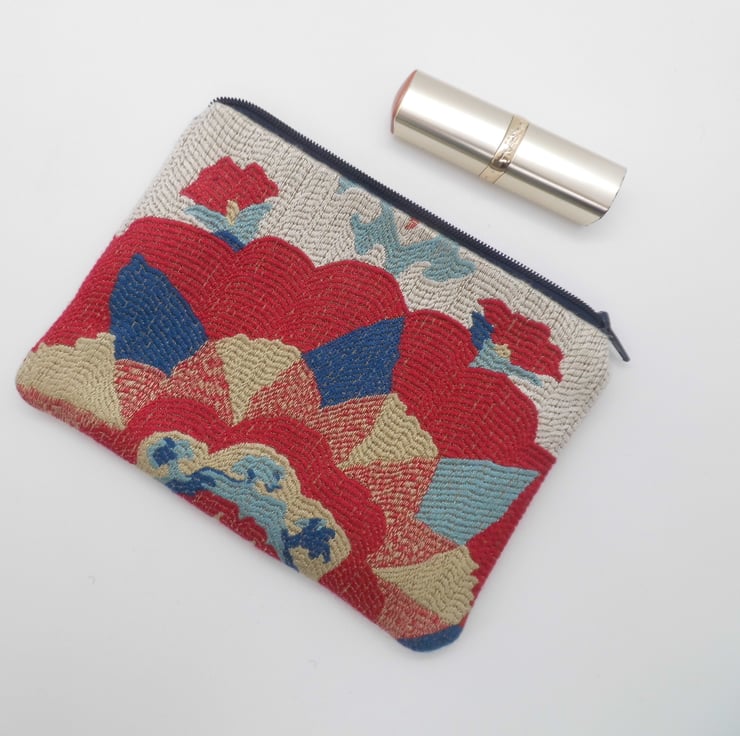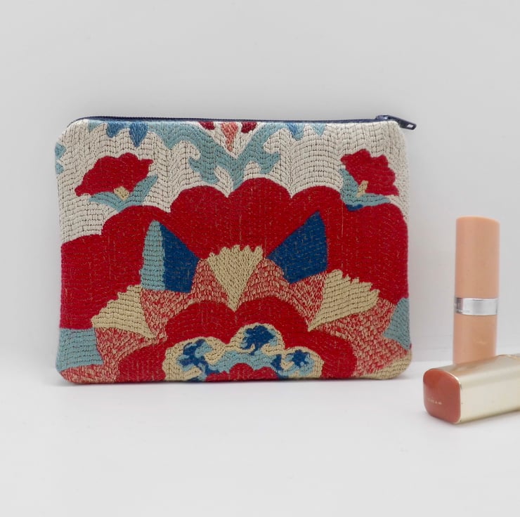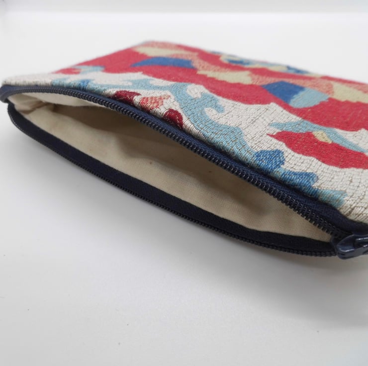 This purse is made in a heavy weight furnishing fabric. It is a nice firm fabric which has a red, blue and beige woven design and almost looks like tapestry. Lined with natural cream calico cotton.
