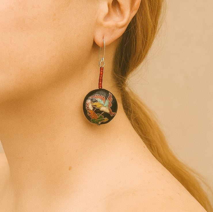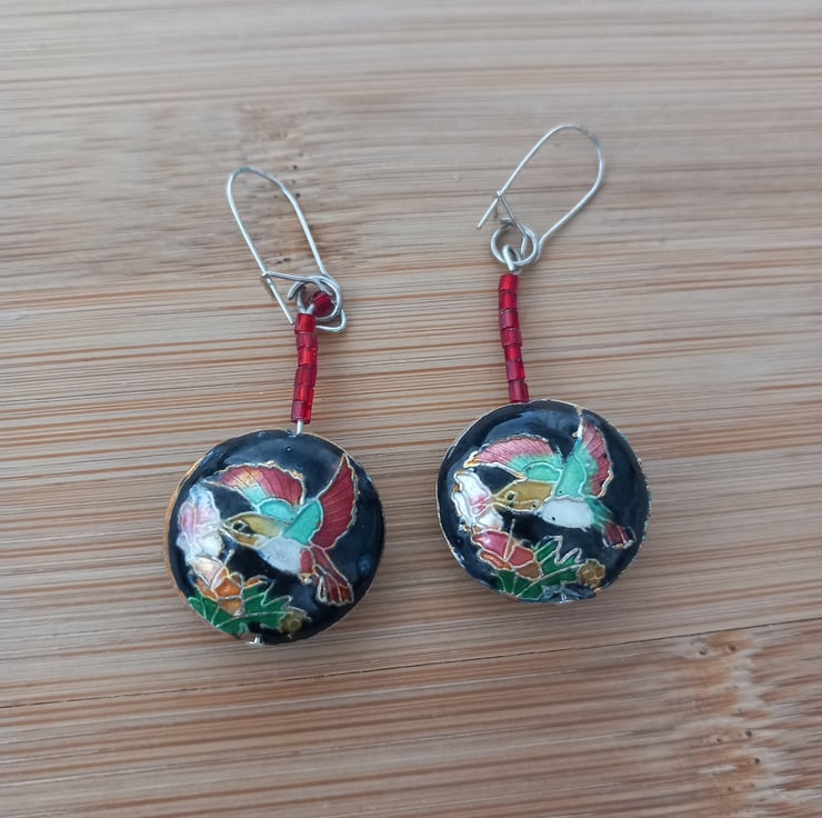 Round enamelled cloisonne beads with a beautiful bird design together with red sead beads. The earwire is silver plated and the earring drop is approximately 3 cm. The earrings will come to you in an organza gift bag. A gift box can be purchased separarely.