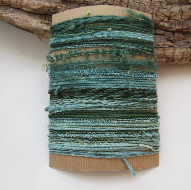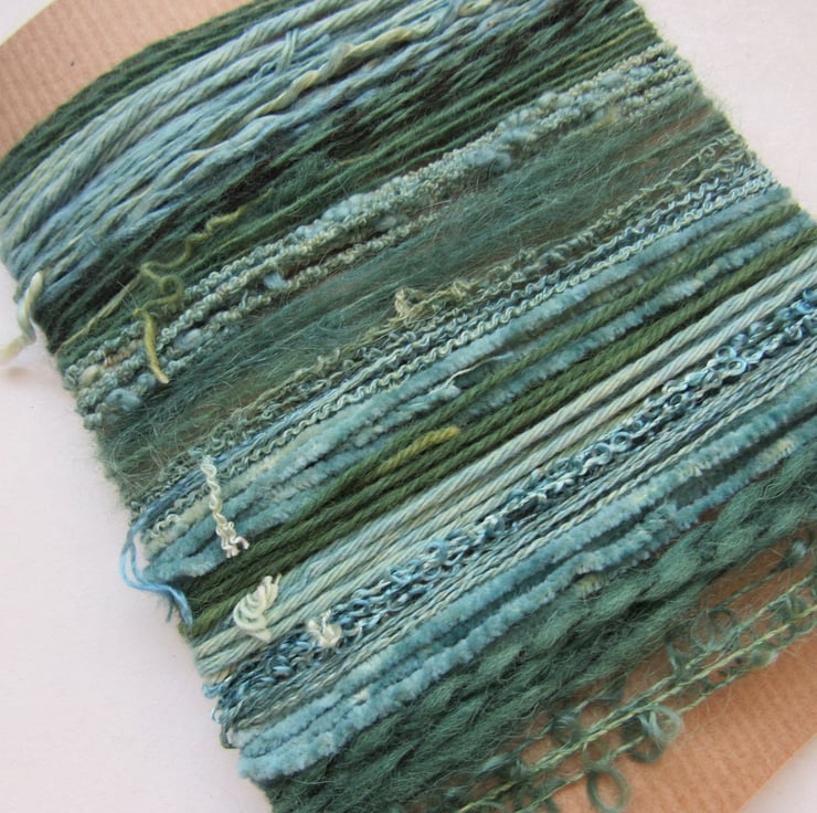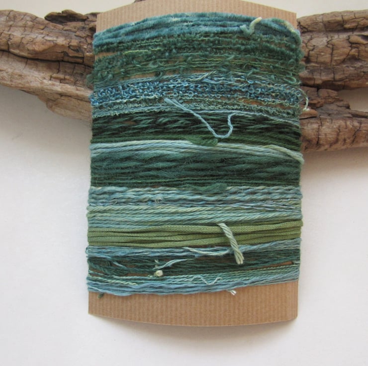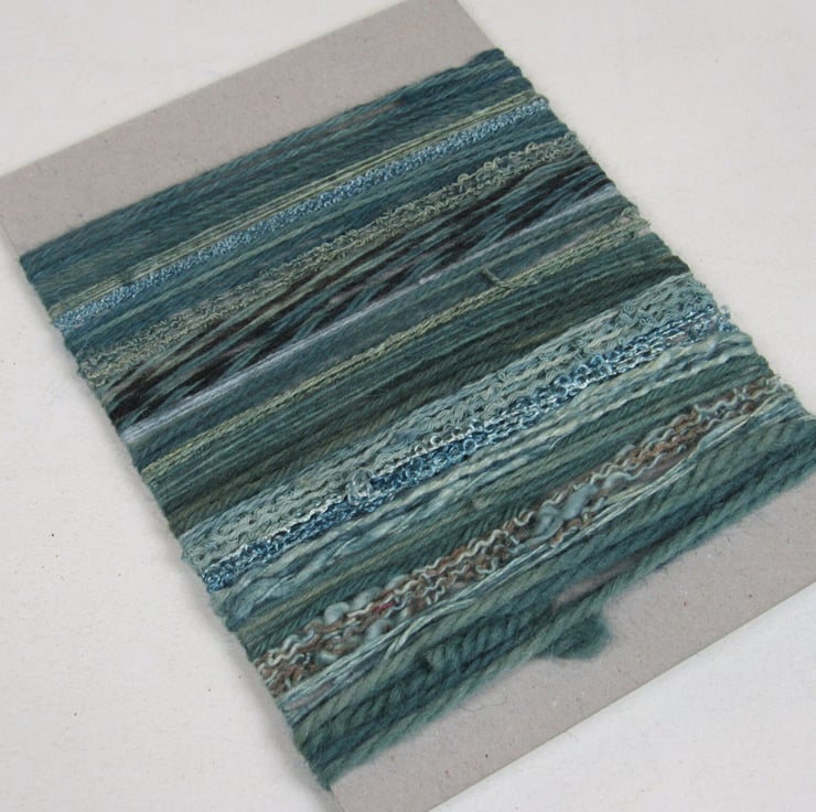 A mix of wools, viscose and cotton. Some are pure and some are blends. The wonderful thing about a mix like this is that the different materials pick up the dye differently, giving a variety of shades as well as textures.