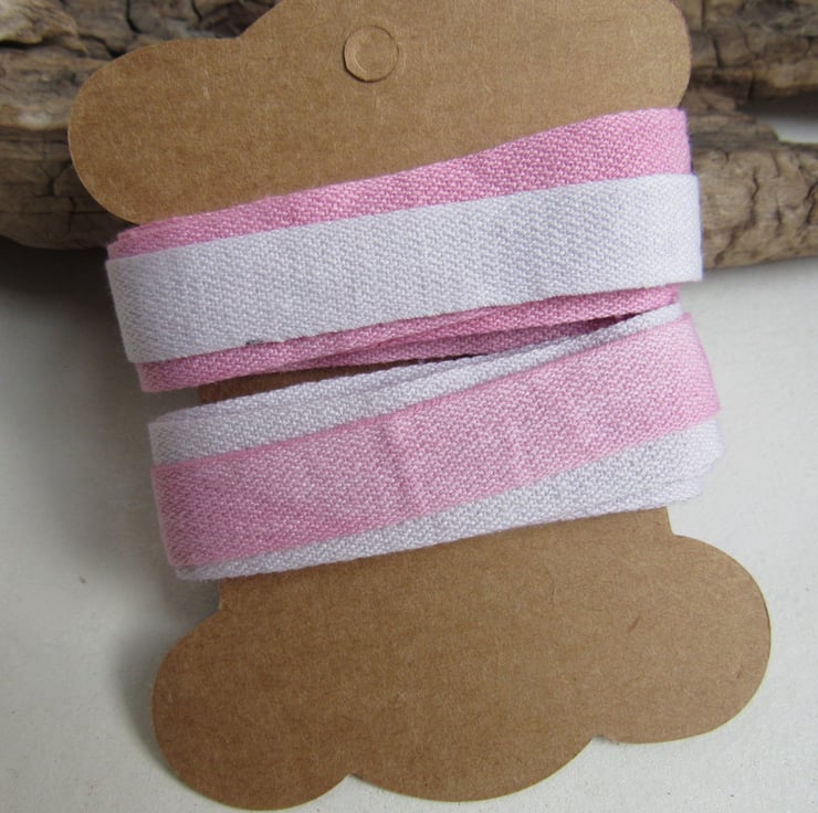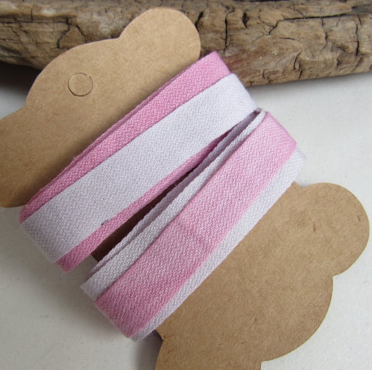4 metre lengths of ribbon, naturally dyed with cochineal or alkanet to give a pastel cherry pink or light violet