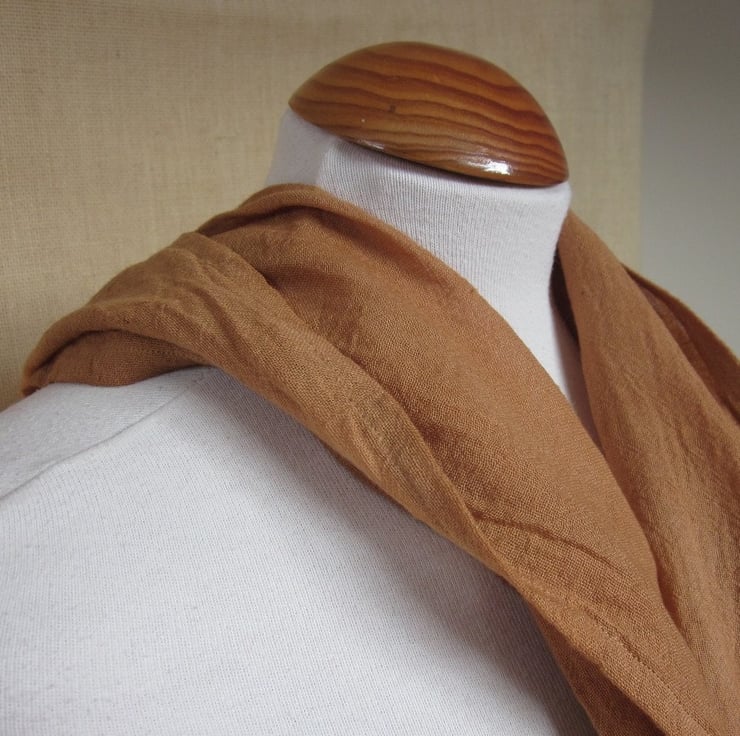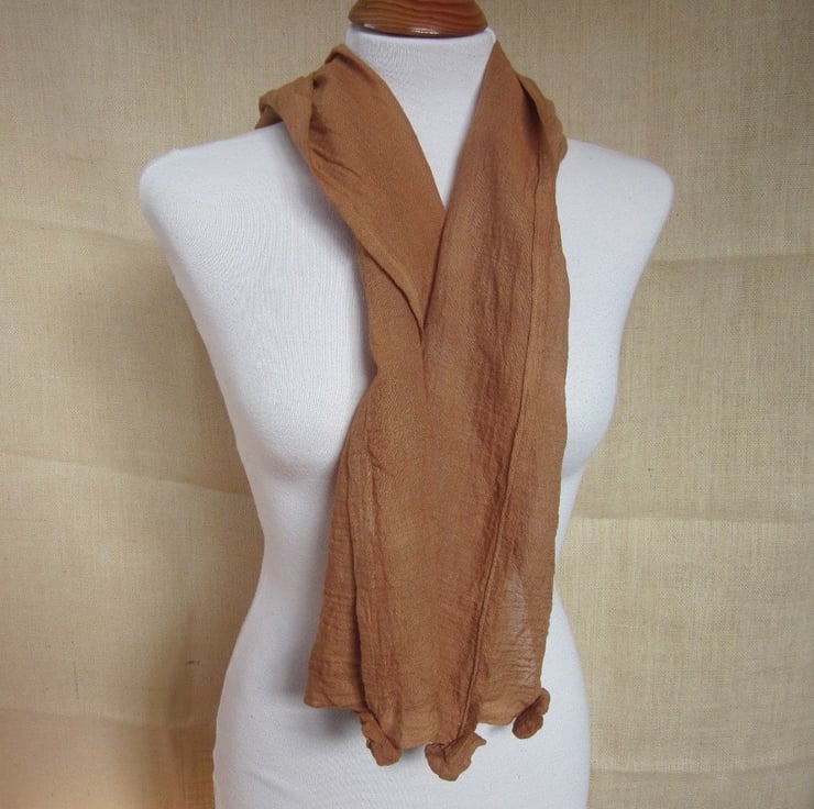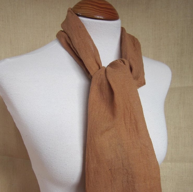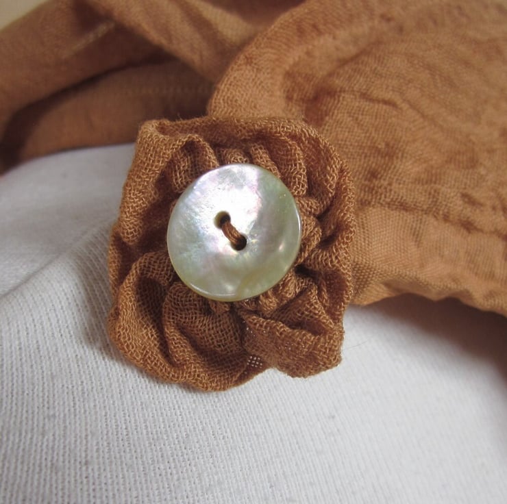 A light cotton muslin scarf, dyed a rich brown with cutch bark. This has a beautiful, earthy, natural feel to it, enhanced by the handstitched rosettes on each corner.