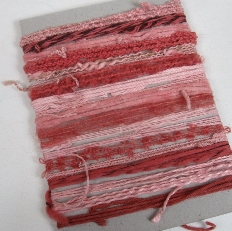 A mix of wools, viscose and cotton. Some are pure and some are blends. The wonderful thing about a mix like this is that the different materials pick up the dye differently, giving a variety of shades as well as textures.