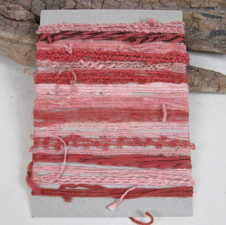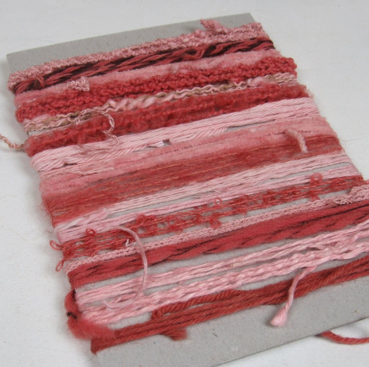 20 lengths of yarns, all approx 1m (40") long, hand dyed to shades of red and orange with natural dye.