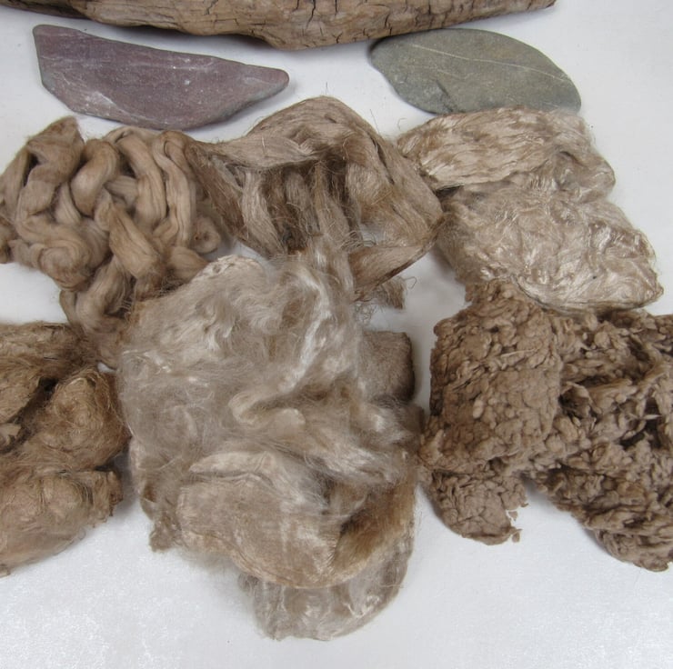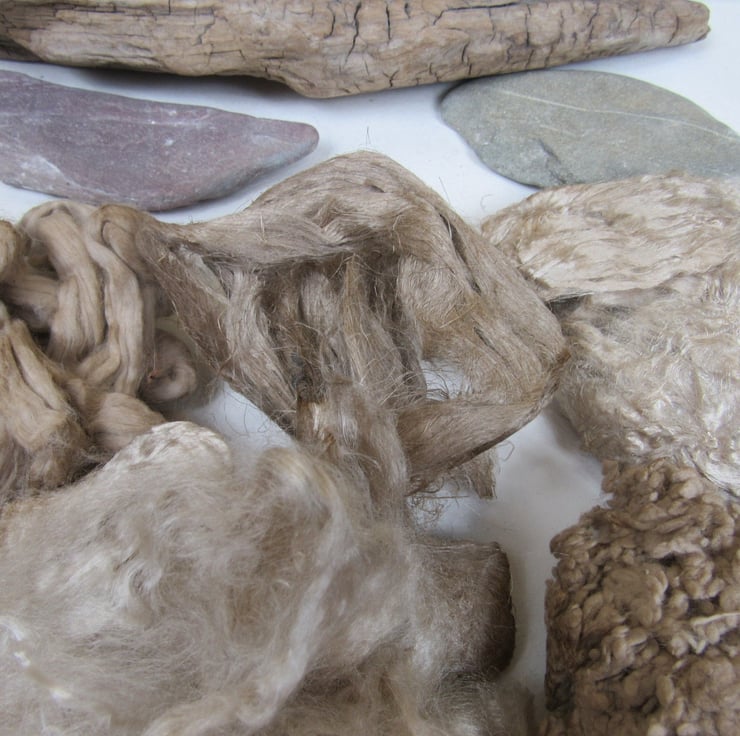 A collection of mixed natural plant fibres and textures, carefully dyed with natural dyes.