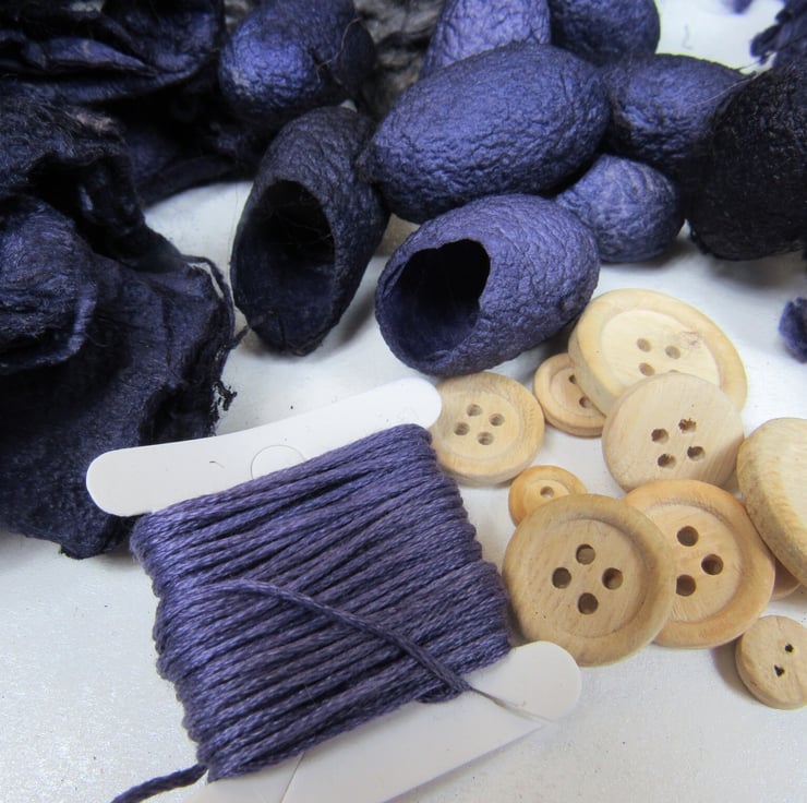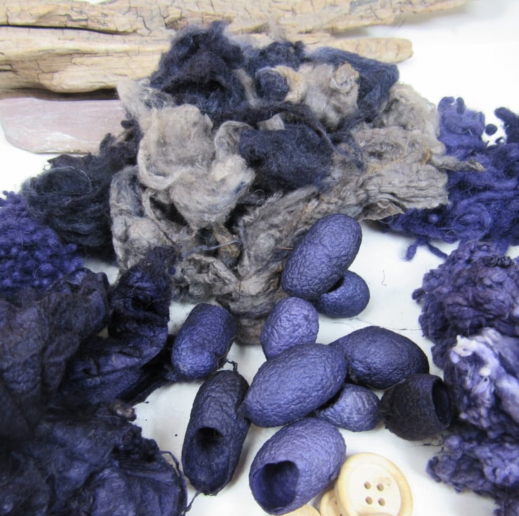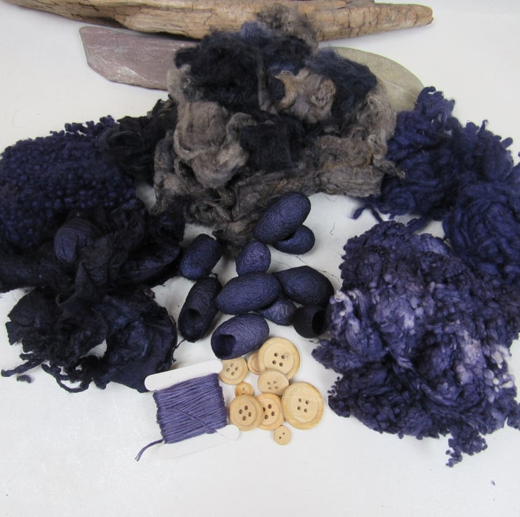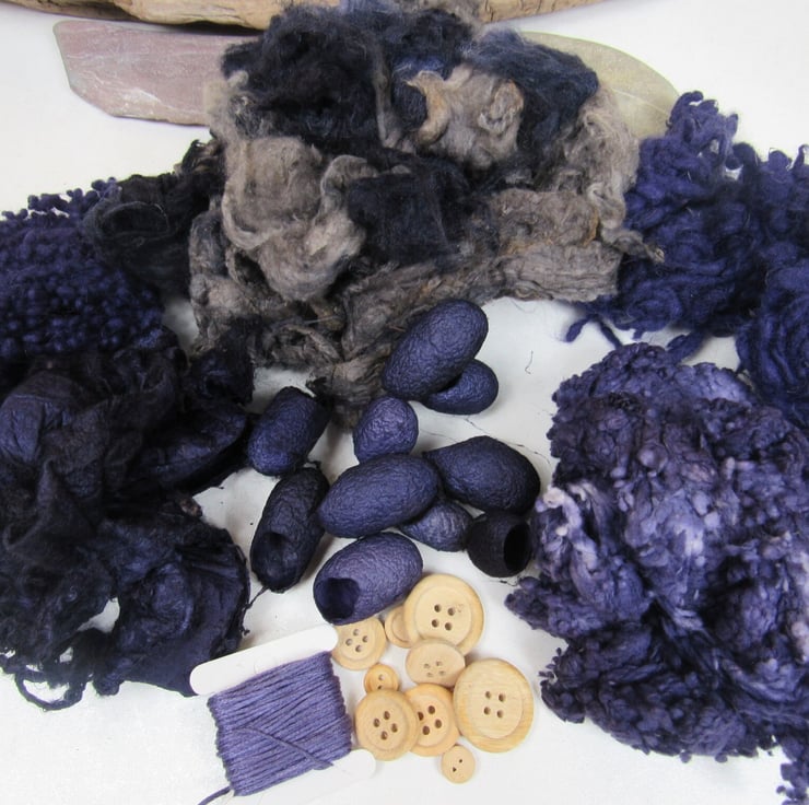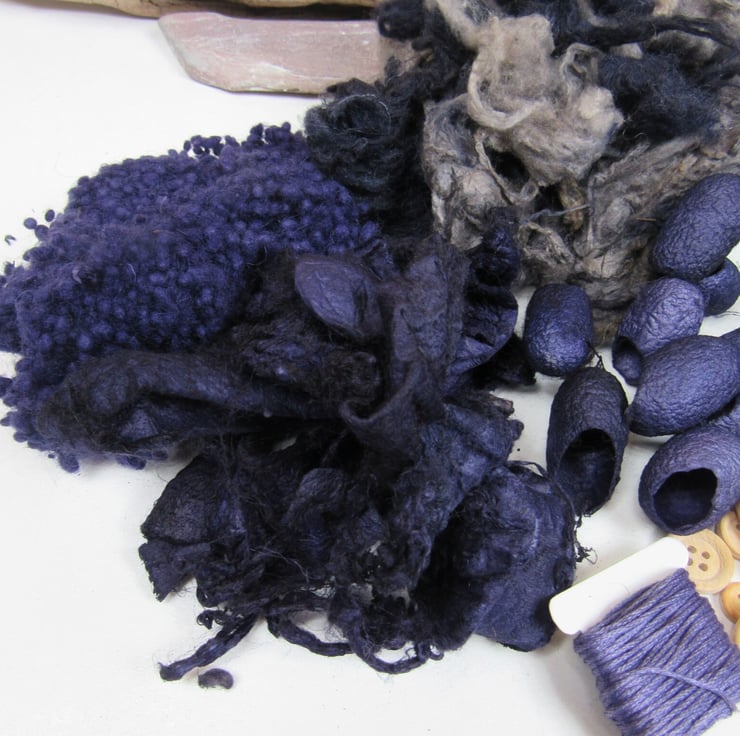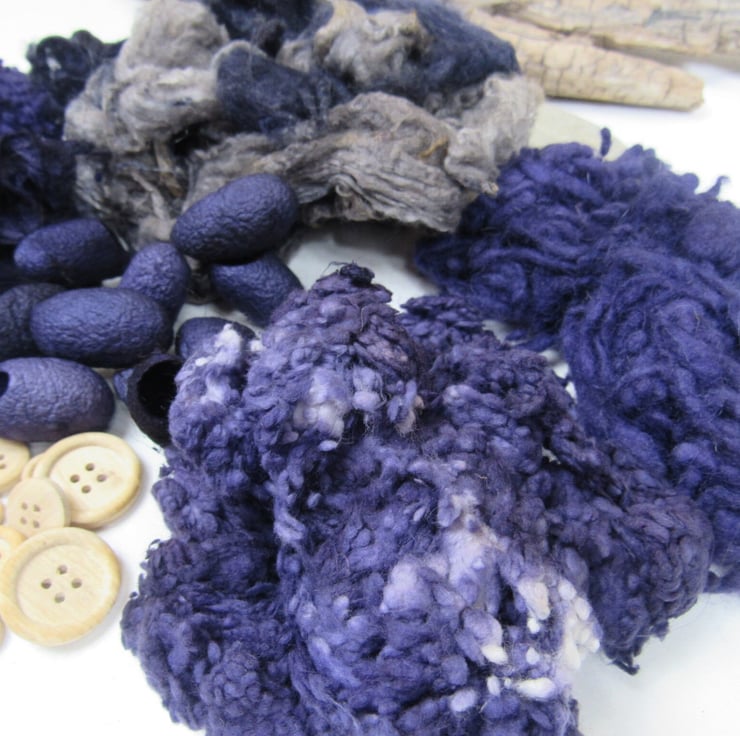 A collection of mixed natural fibres and textures, carefully dyed to shades of purple and grey with natural dyes.