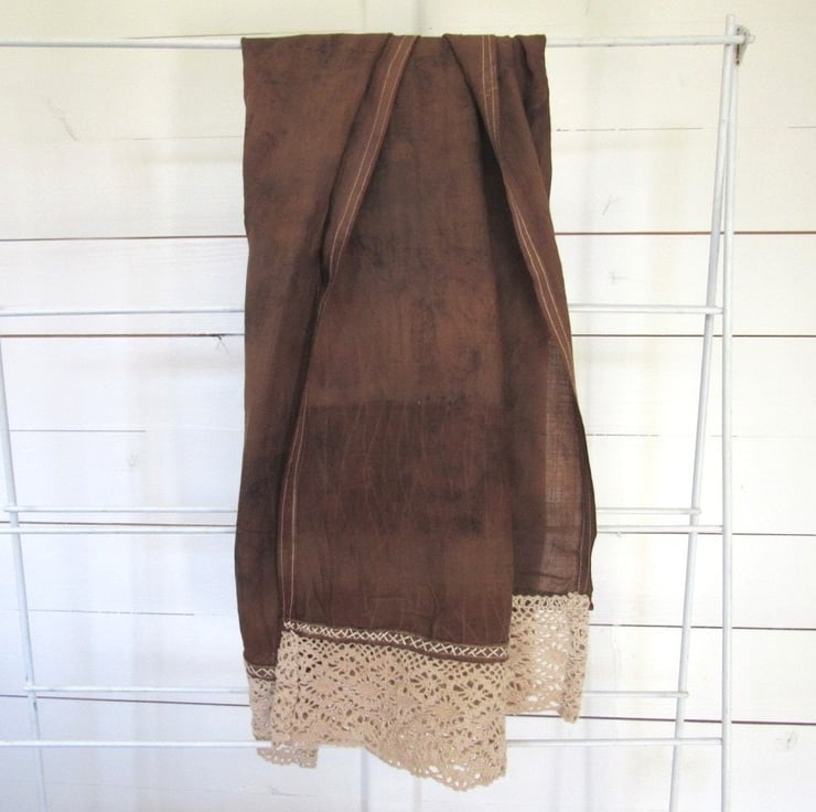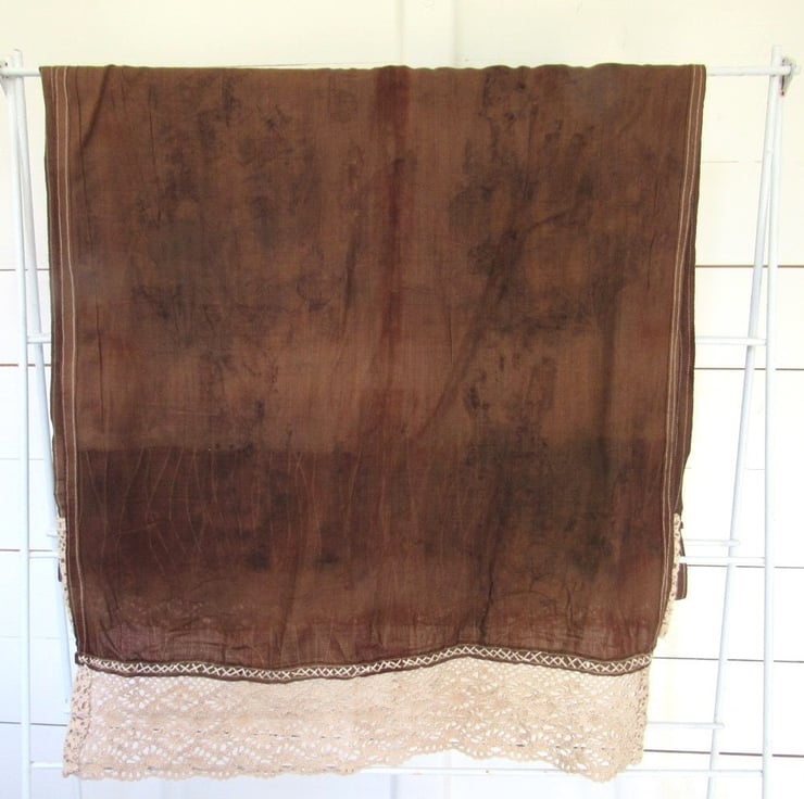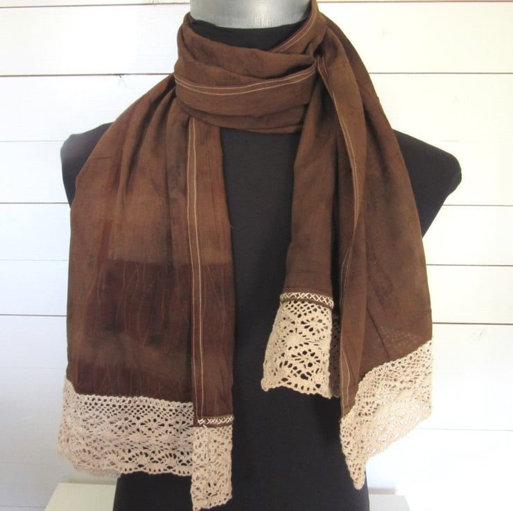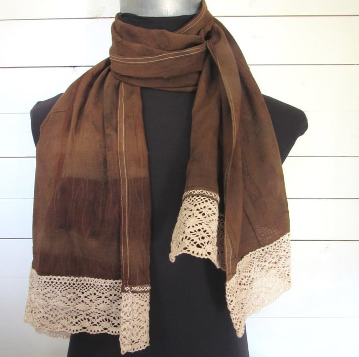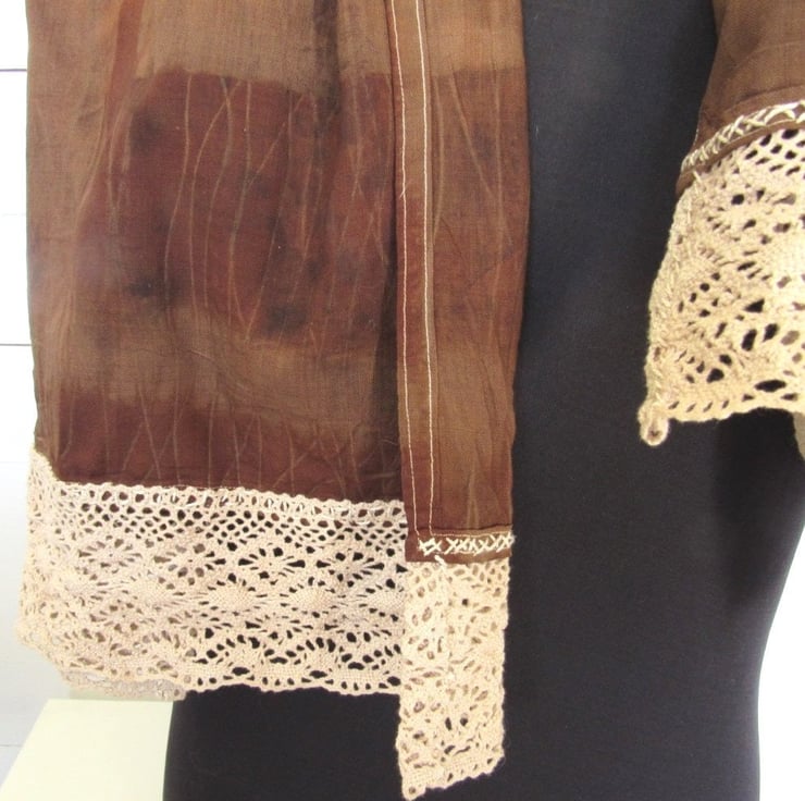 After dyeing, the fabric was layers with leaves and steamed, to produce a delicate black leaf pattern across the scarf. The piece was finished with a deep layer of walnut dyed cotton lace hand-stitched at each end.