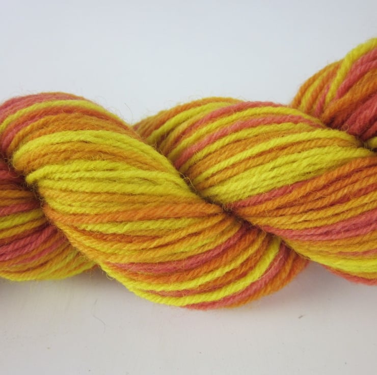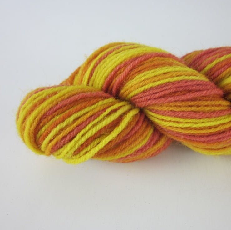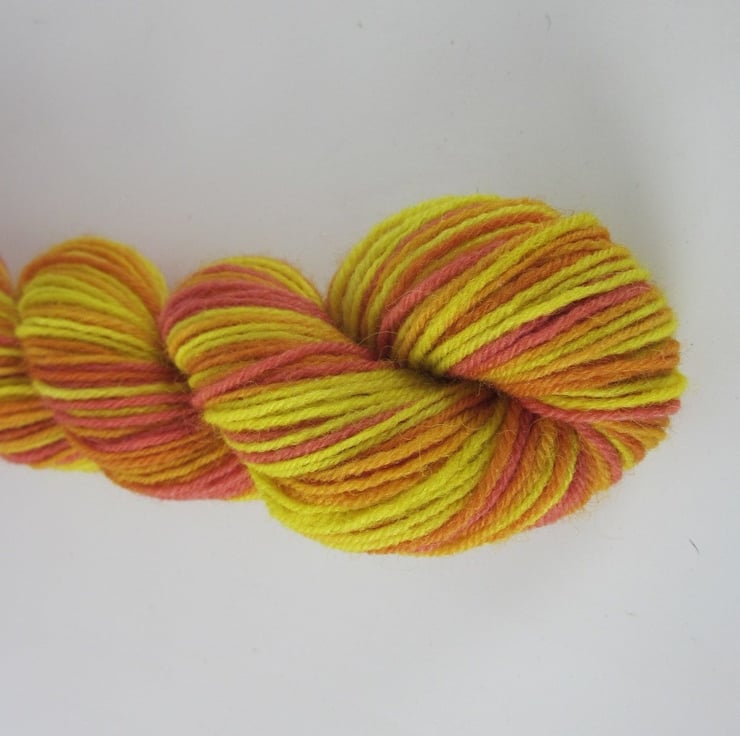 100g soft 80% Merino superwash, 20% bamboo sockweight yarn dip dyed with a range of natural plant dyes to give a shaded pattern of red, orange and yellow