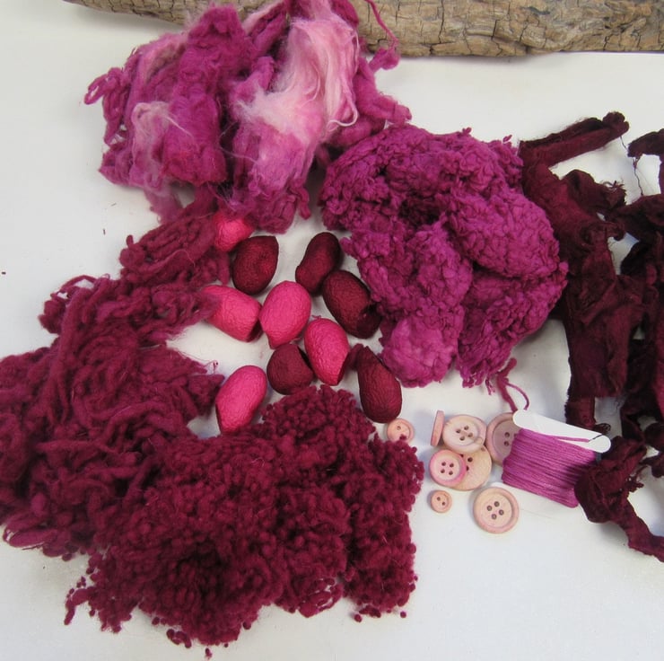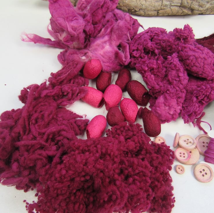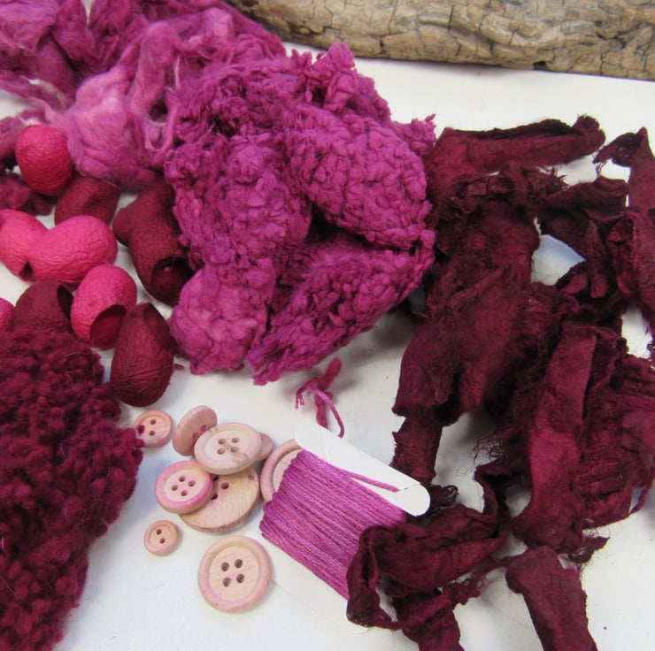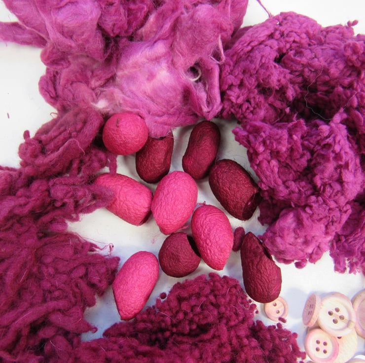 A collection of mixed natural fibres and textures, carefully dyed with natural dyes.