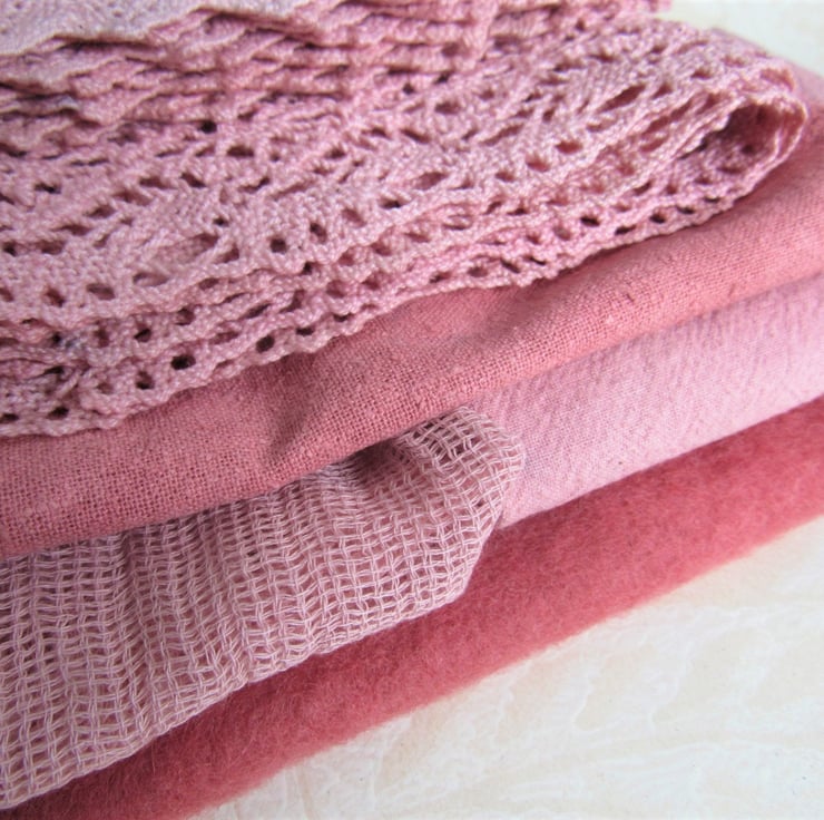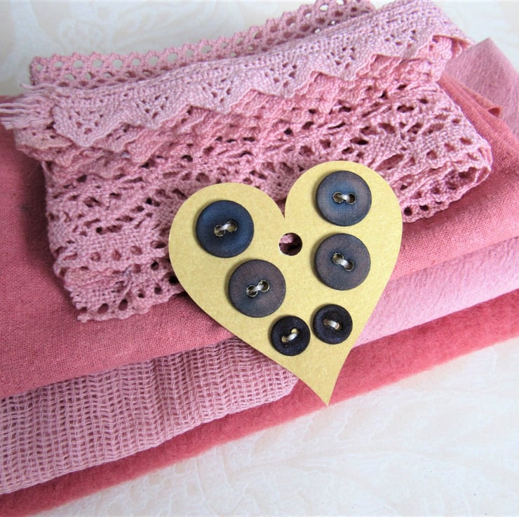 A collection of fabric, lace and buttons, ideal for mixed-media and embroidery, hand dyed with vegetable dyes to a rich dark pink