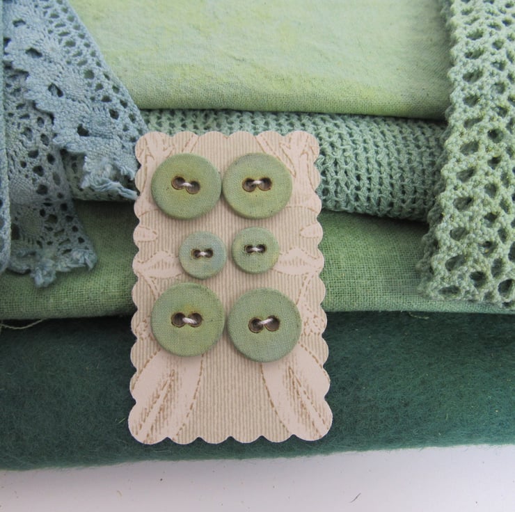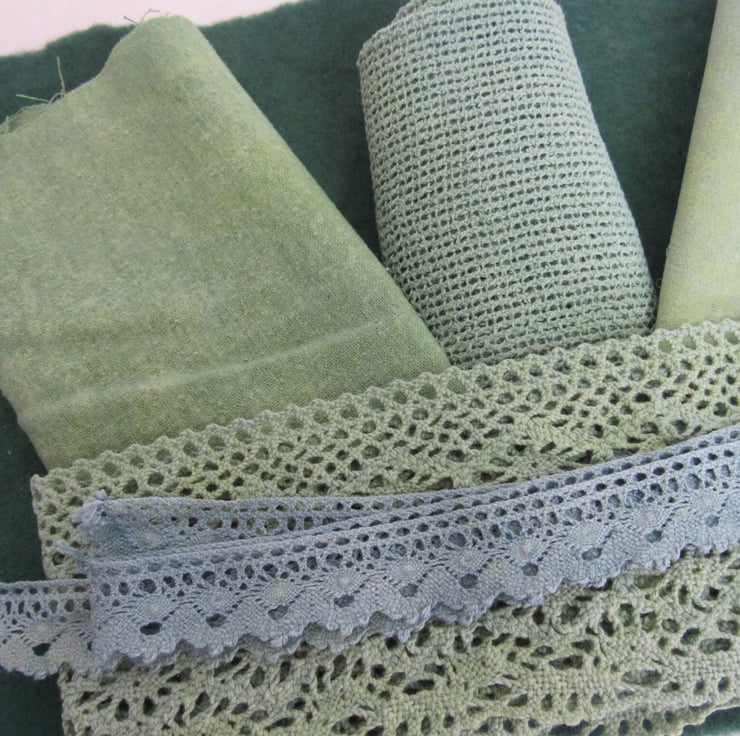 A collection of fabric, lace and buttons, ideal for mixed-media and embroidery, hand dyed with natural dyes and indigo to a bright fresh green