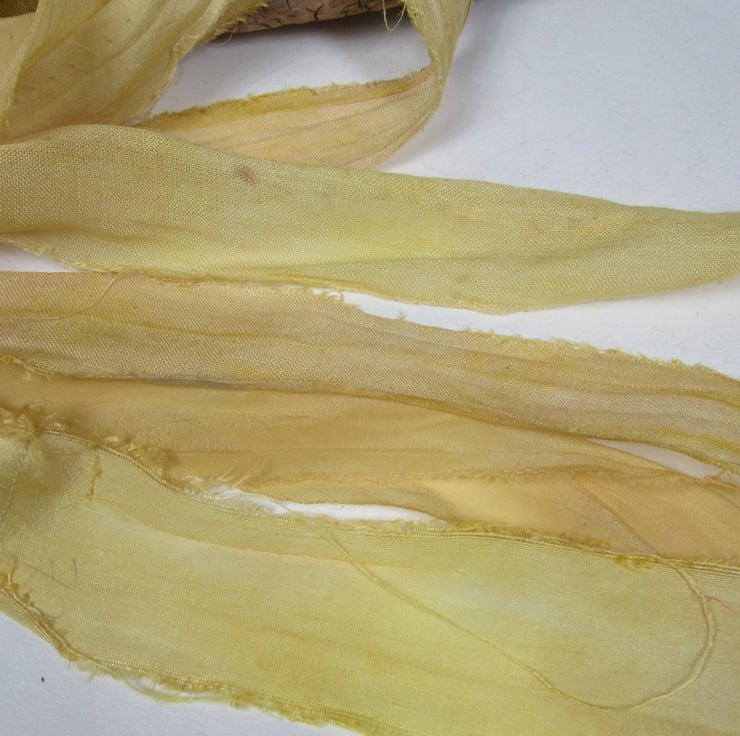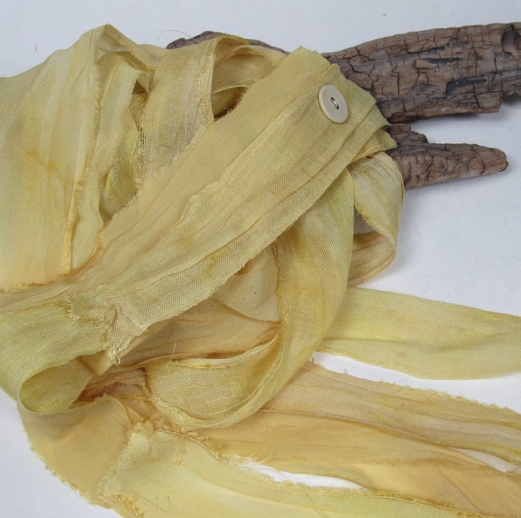 4 lengths of ribbon, naturally dyed with weld to give pale yellow shades. Finished with a large linen button