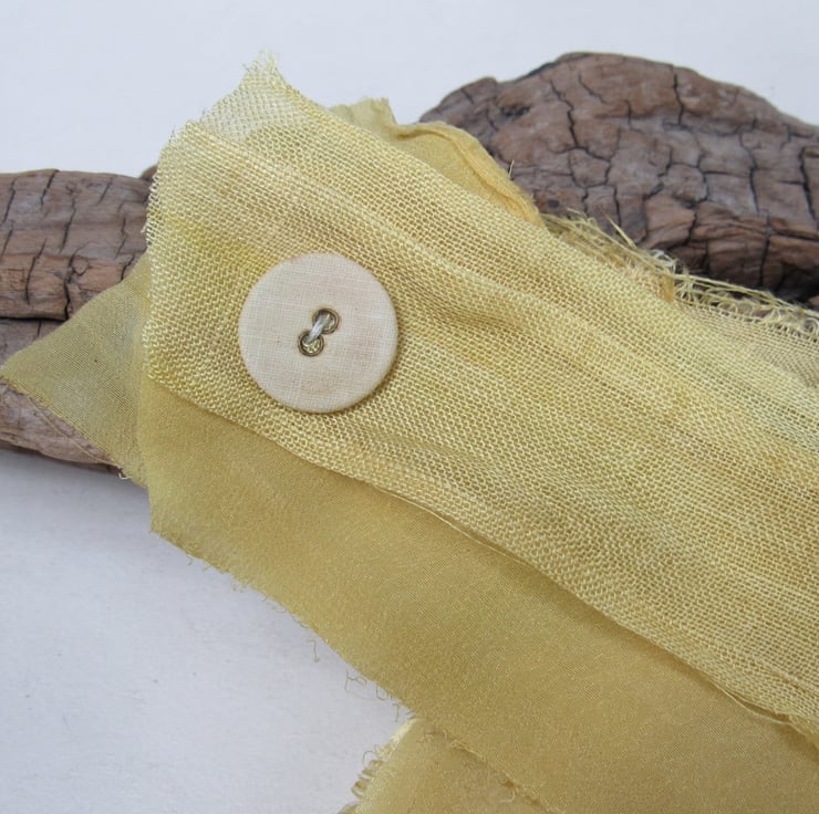 4 lengths of ribbon, naturally dyed with weld to give pale yellow shades. Finished with a large linen button