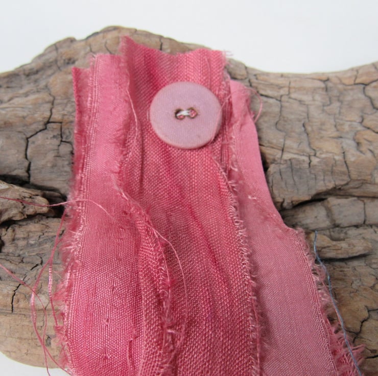4 lengths of ribbon, naturally dyed with brazilwood to give dark pink shades. Finished with a large line button