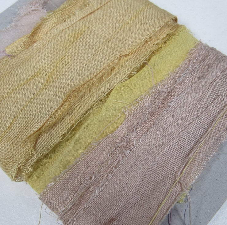 4 lengths of ribbon, naturally dyed with pomegranate or walnut to give pale yellow and brown shades