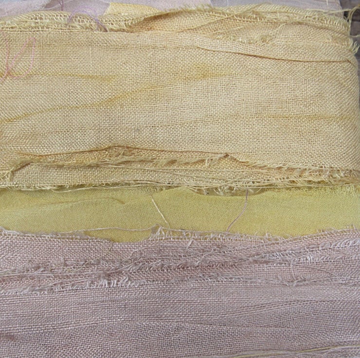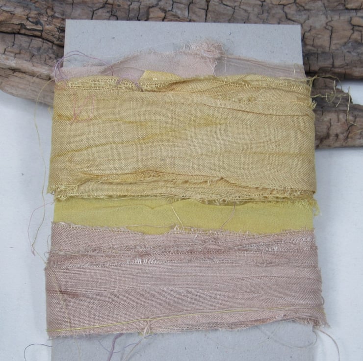 4 lengths of ribbon, naturally dyed with pomegranate or walnut to give pale yellow and brown shades