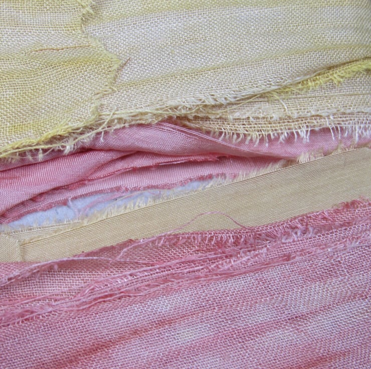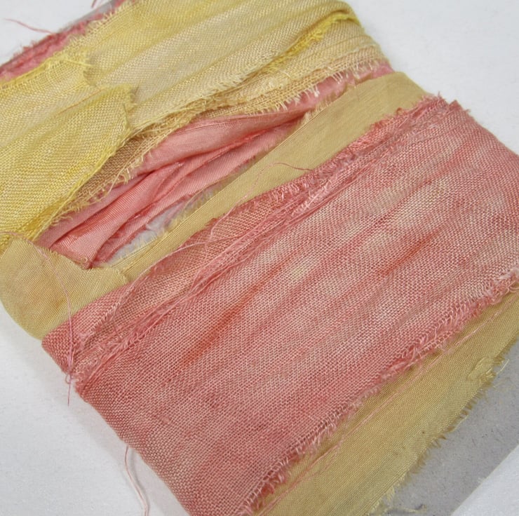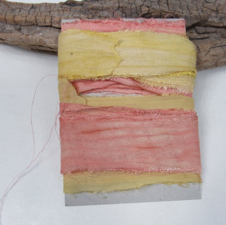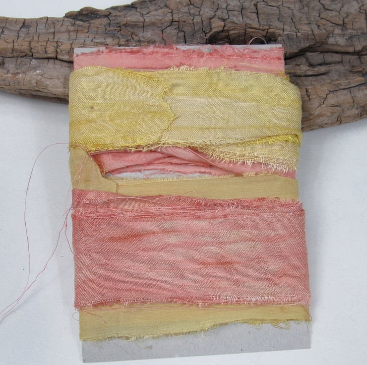 4 lengths of ribbon, naturally dyed with madder or weld to give pale yellow and pink shades