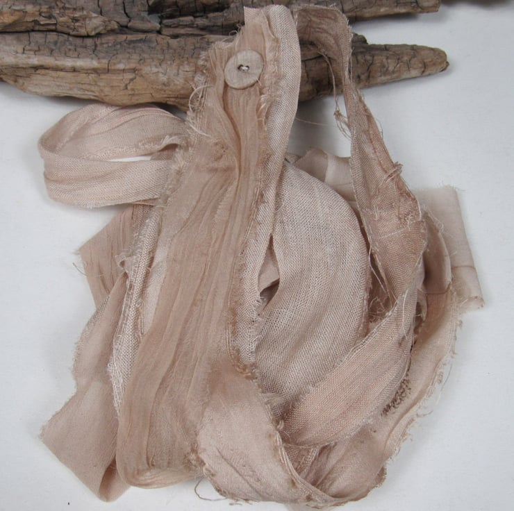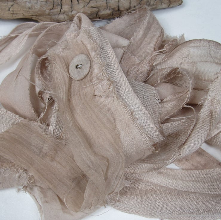 4 lengths of ribbon, naturally dyed with walnut to give pale brown shades. Finished with a large linen button.