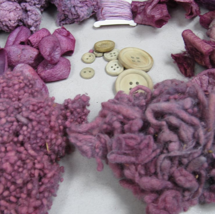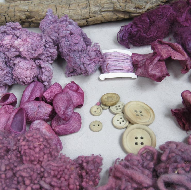 A collection of mixed natural fibres and textures, carefully dyed with natural dyes.