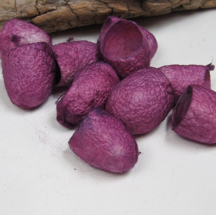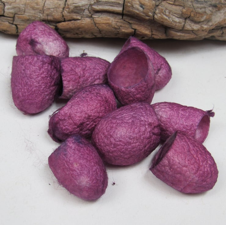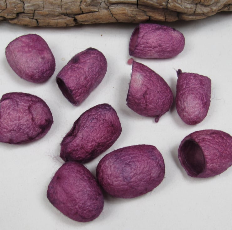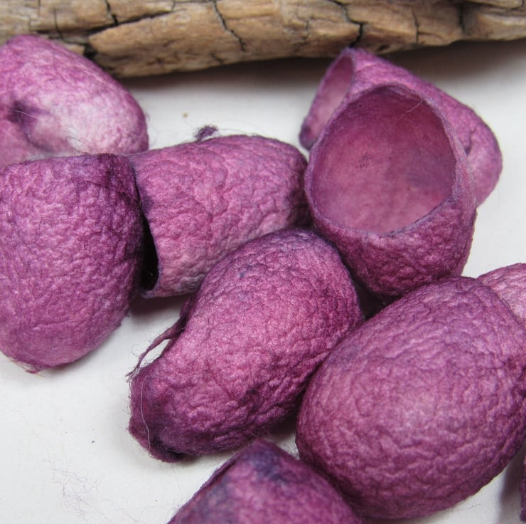 10 Silk Cocoons hand dyed with natural cochineal pink then overdyed with indigo to give a 2-tone effect