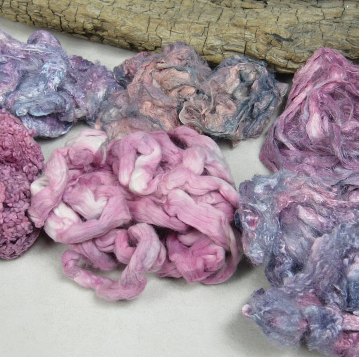 A collection of mixed natural plant fibres and textures, carefully dyed with natural dyes.