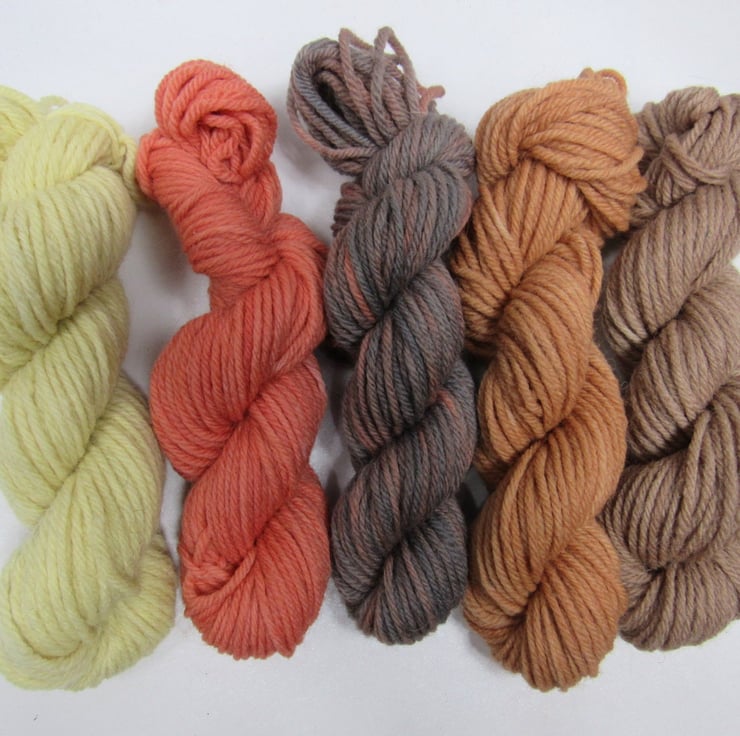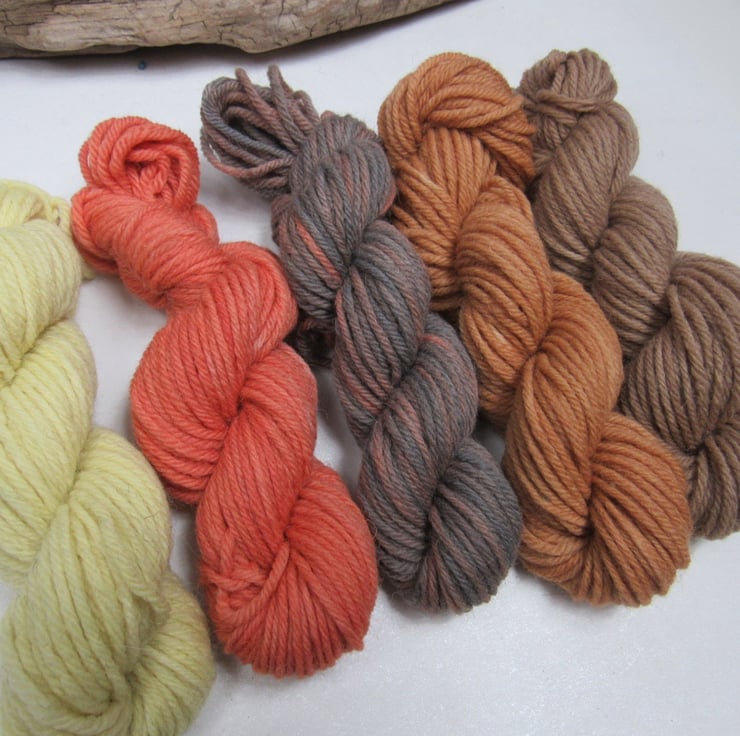 5 mini skeins, each 20g of 4-ply Highland fleece yarn, dyed with an array of natural dyes to give a range of golds, greens and browns.