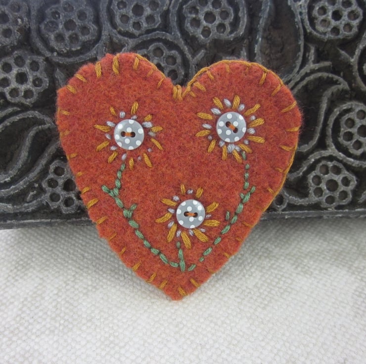 Rust Red Embroidered Flower Heart Shaped Felt Brooch