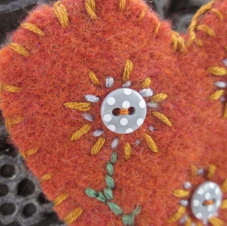 A cute heart shaped brooch made from knitted, felted dove grey wool. Embellished with tiny polkadot buttons made into small flowers with the addition of embroidered orange and grey petals and sage green stems