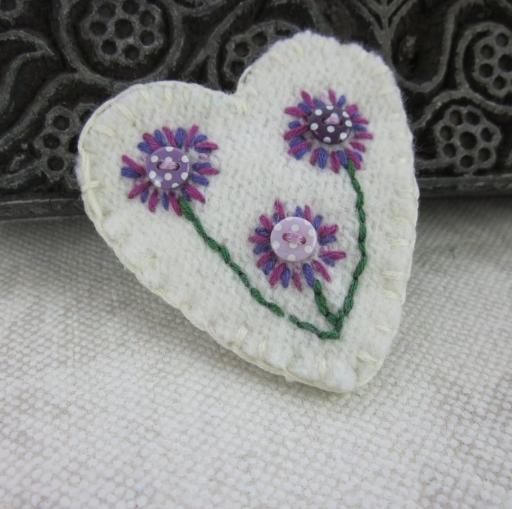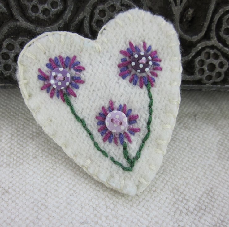 A cute heart shaped brooch made from knitted, felted pale cream wool. Embellished with tiny polkadot buttons made into small flowers with the addition of embroidered pink and purple petals and dark green stems