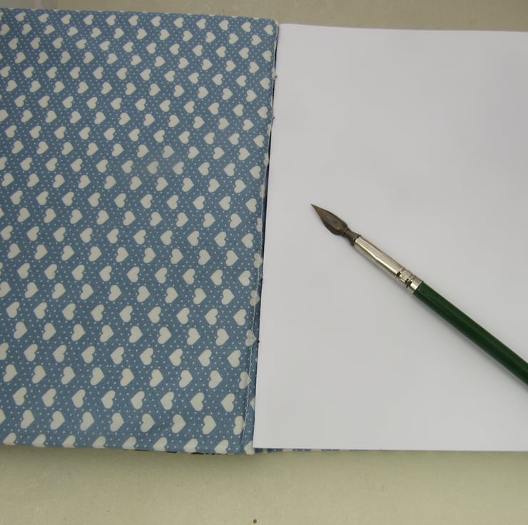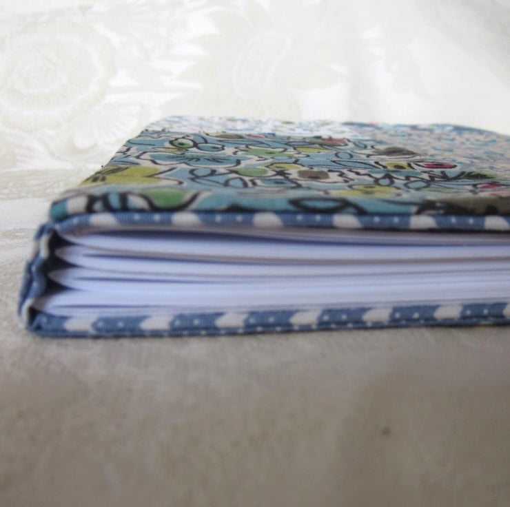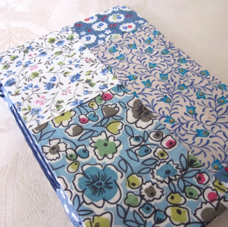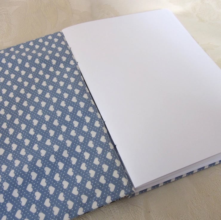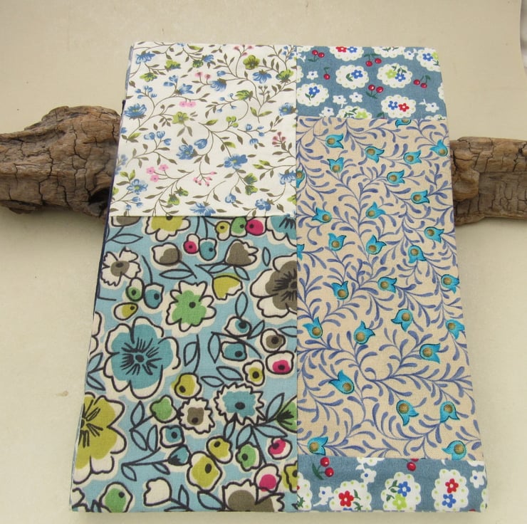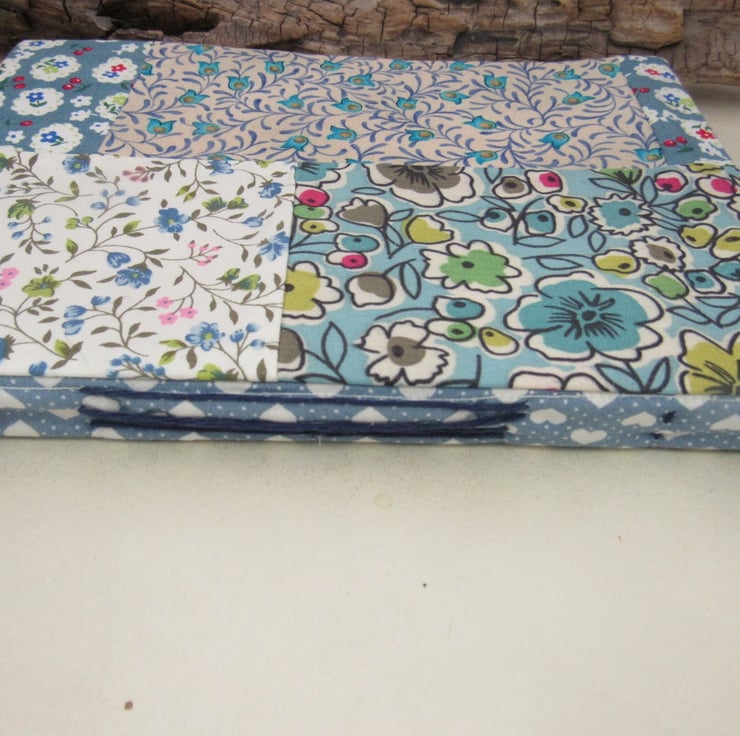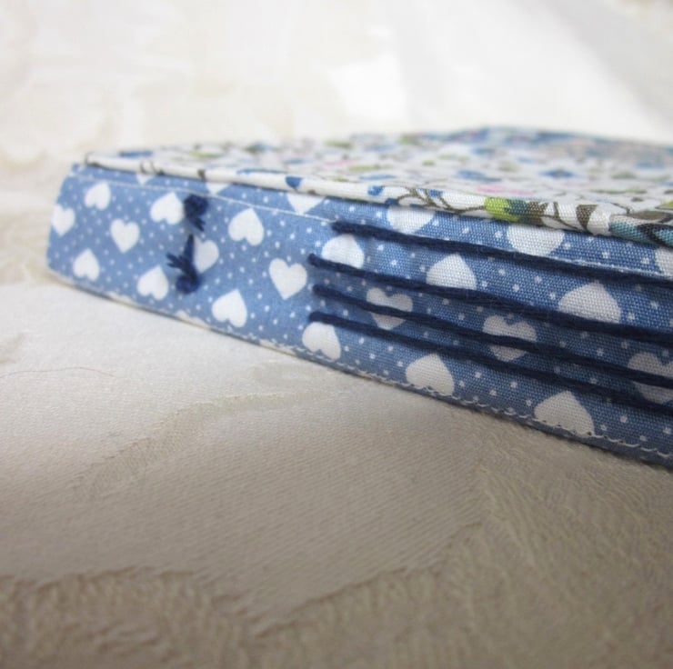 Small pieces of retro and vintage cotton, patchworked together and turned into a pretty and sturdy book cover. The front cover has many floral patterns themed around blue grey florals. The spine, inside covers and back are made from a cute blue and white cotton heart print and the pages are bound with navy blue linen thread