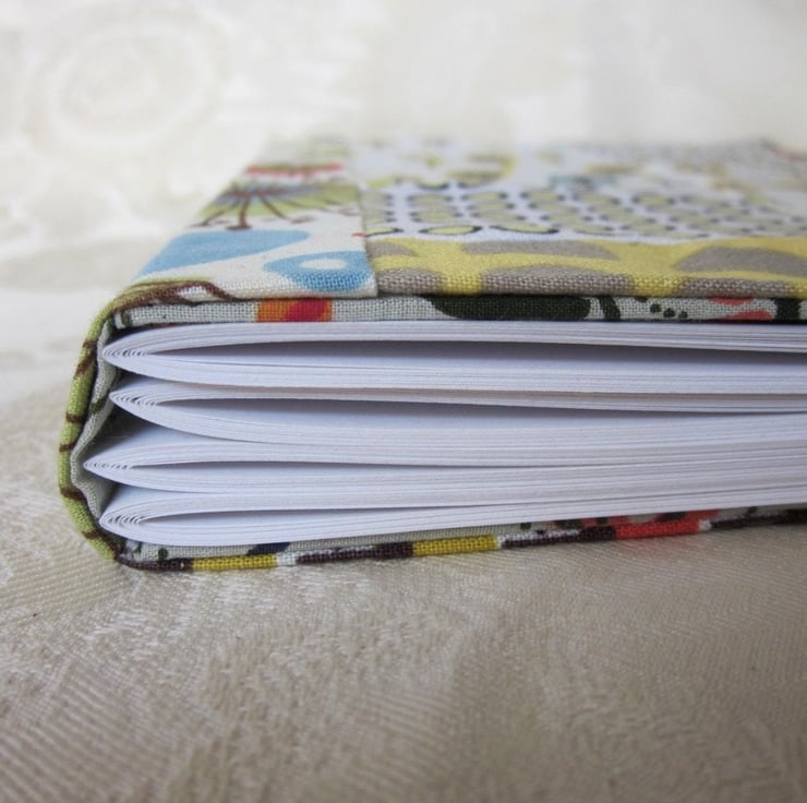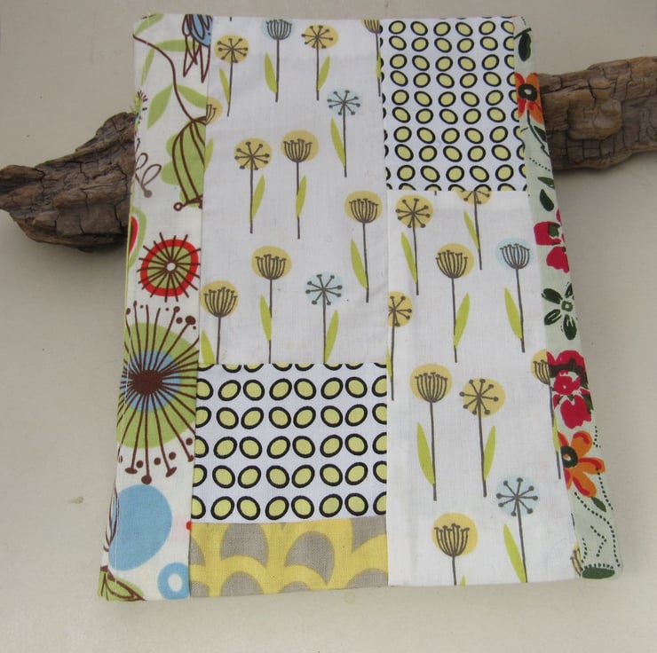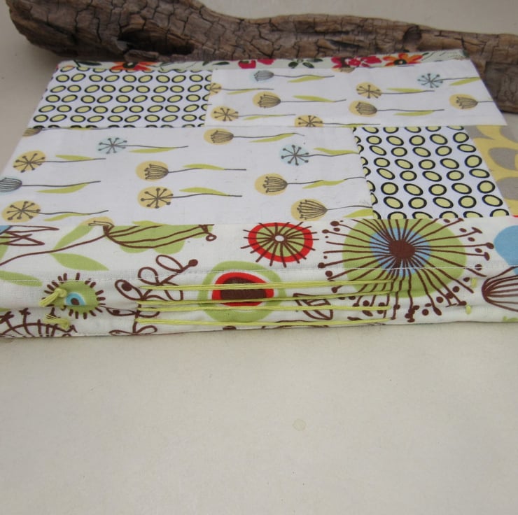 Small pieces of retro and vintage cotton, patchworked together and turned into a pretty and sturdy book cover. The front cover and spine have many floral patterns themed around yellow green florals. The back and inside covers are covered in a fabulous retro floral print from and the pages are bound with yellow green linen thread