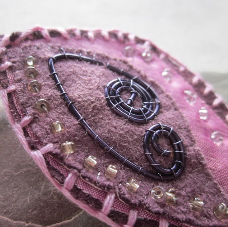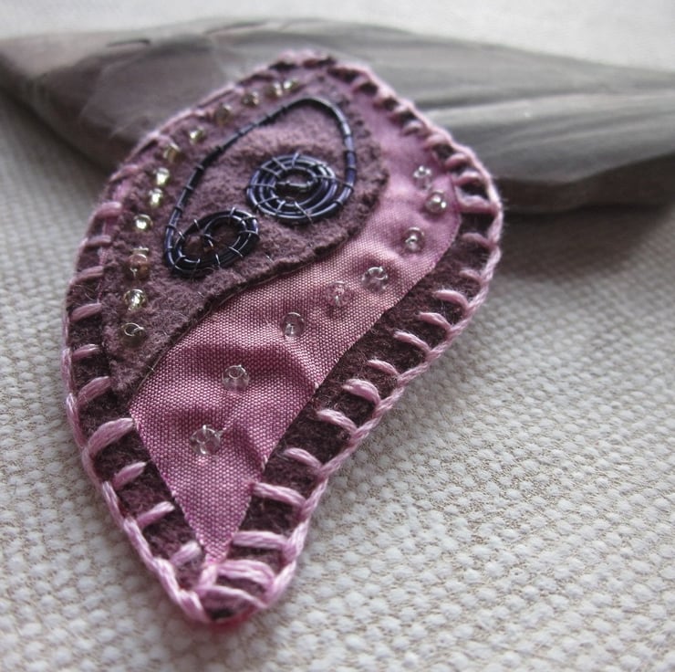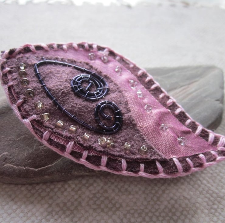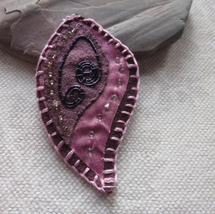 This leaf shaped brooch is made up of several layers. At base is a plum purple faux suede, covered with pink silk and beaded. On top of this is a smaller purple leaf shape embellished with seed beads and coiled blue wire. The fabric was salvaged from unwanted sample books.