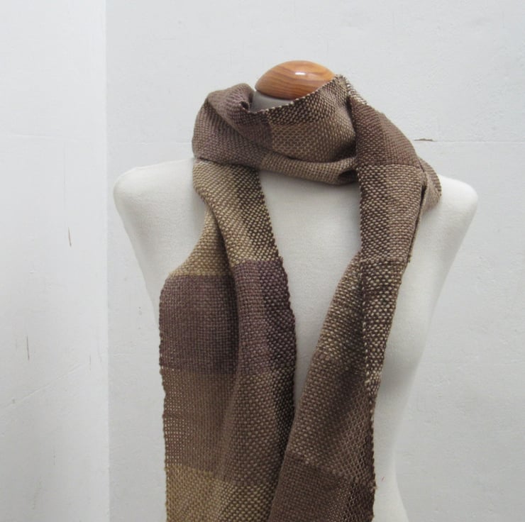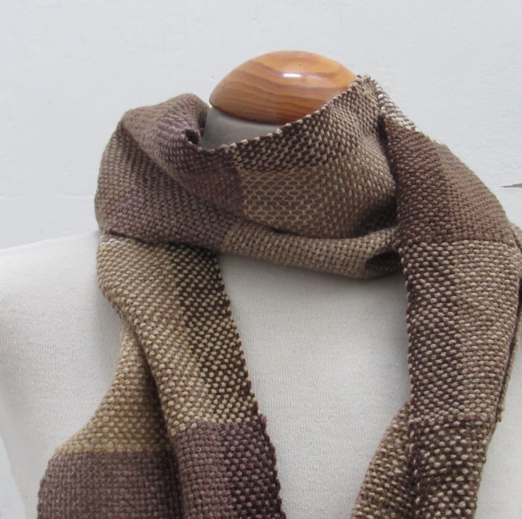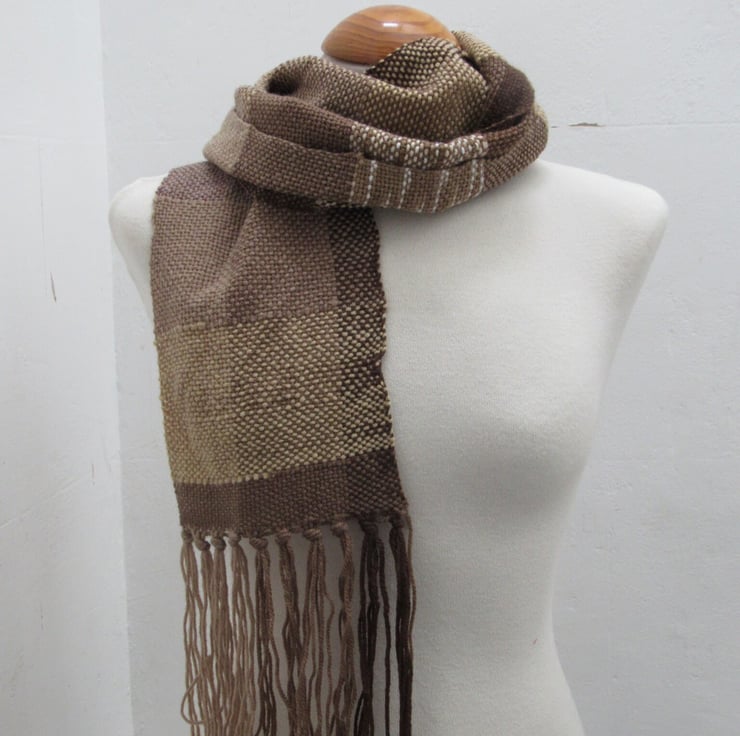 Hand woven from salvaged and scrap fibres in shades of brown and beige. Yarns used are a mix of natural and artificial fibres, blended to give a warm and eye-catching scarf.