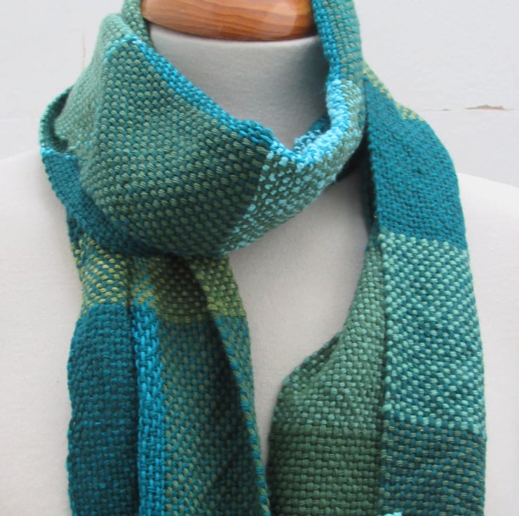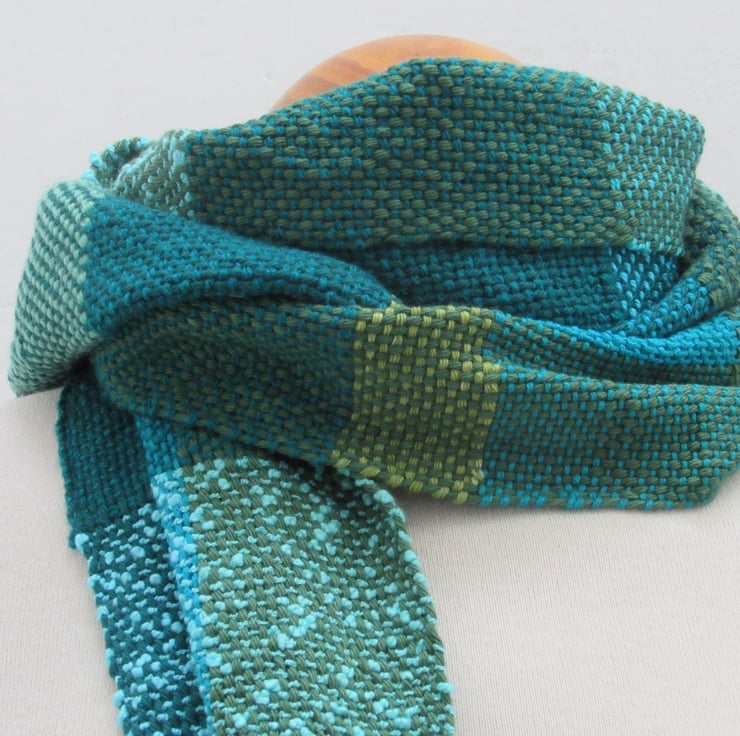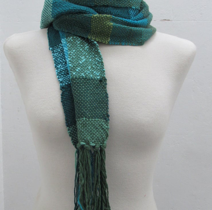 Hand woven from salvaged and scrap fibres, this bright scarf is made from a mix of natural and artificial yarns in shades of green and turquoise