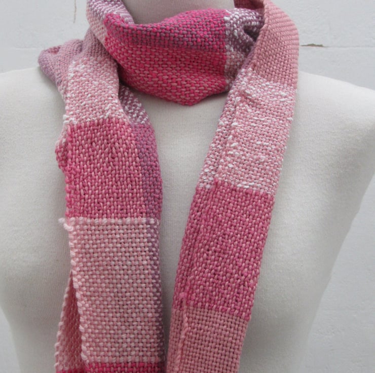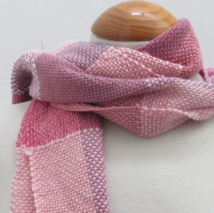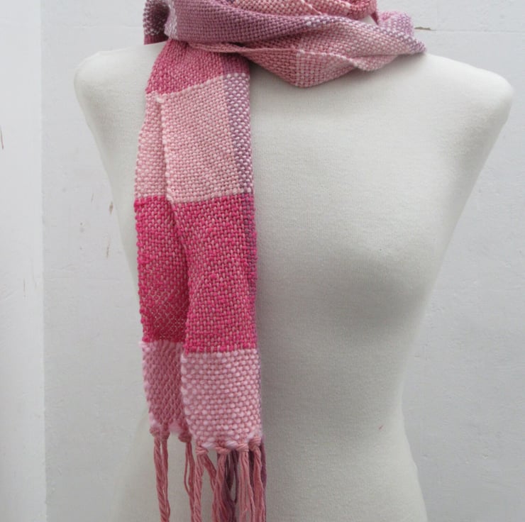 Hand woven from salvaged and scrap fibres in shades of pink and purple. Yarns used are a mix of natural and artificial fibres, blended to give a warm and eye-catching scarf.