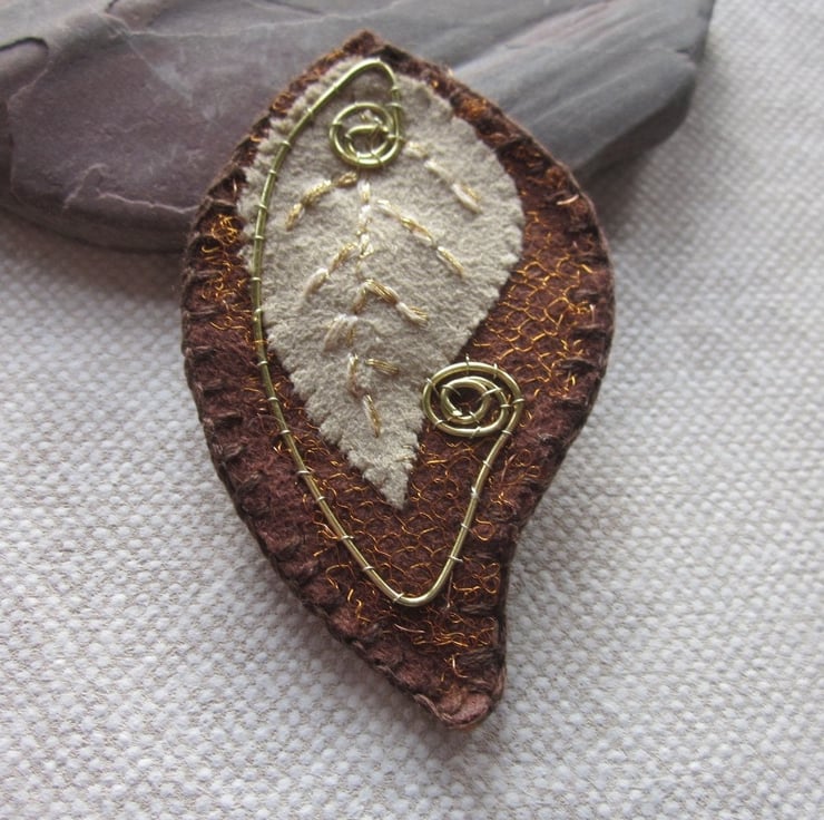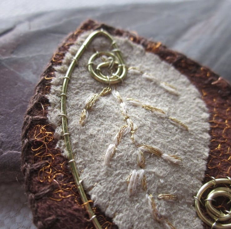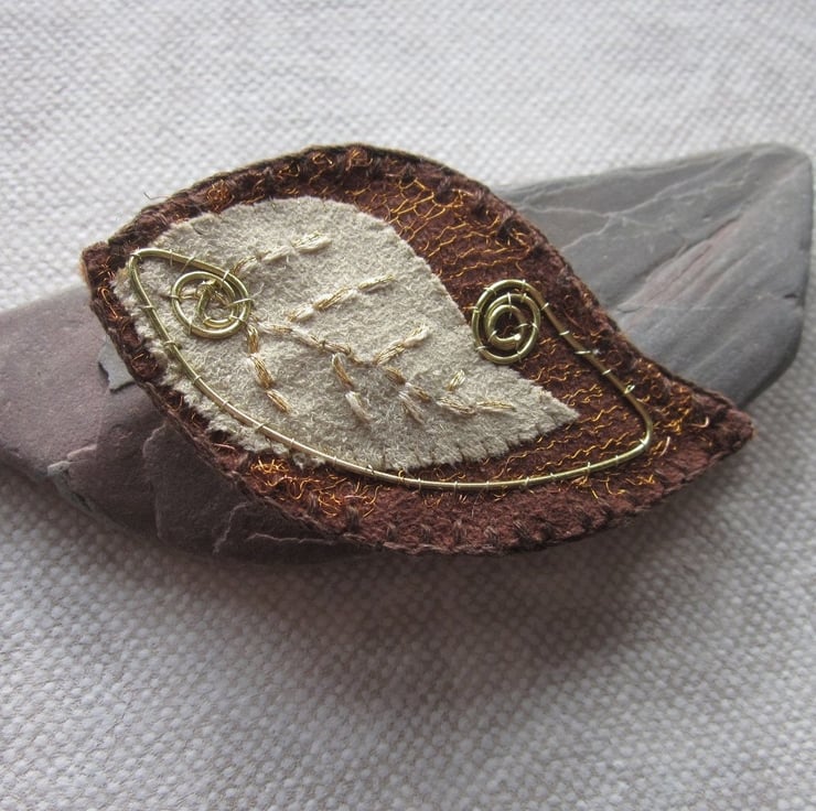 Layered fabric brooch in shades of brown and gold. At base is a rust brown faux suede leaf, covered with a knitted copper wire net. Overlaying this is a small fawn faux suede leaf with an embroidered vein pattern and coiled spiral of wire.