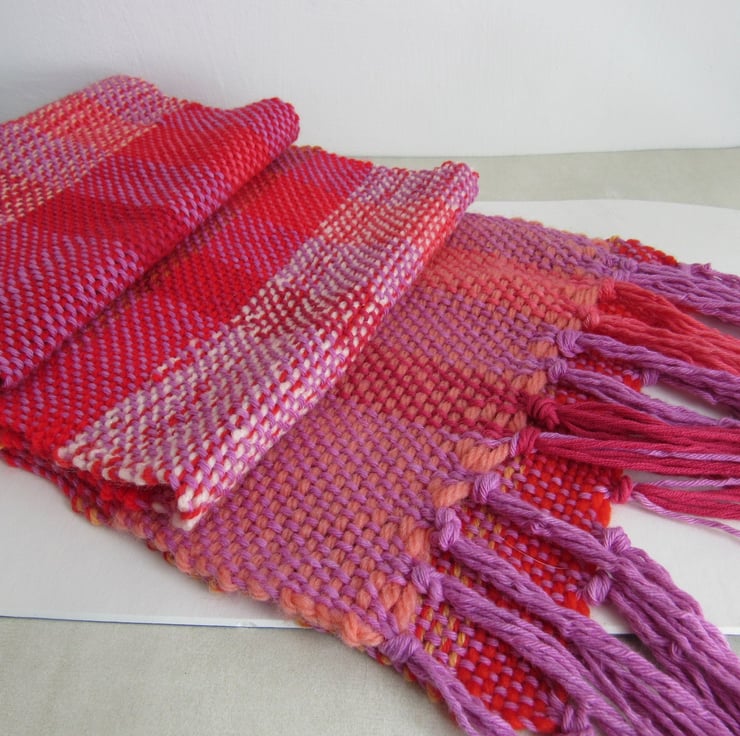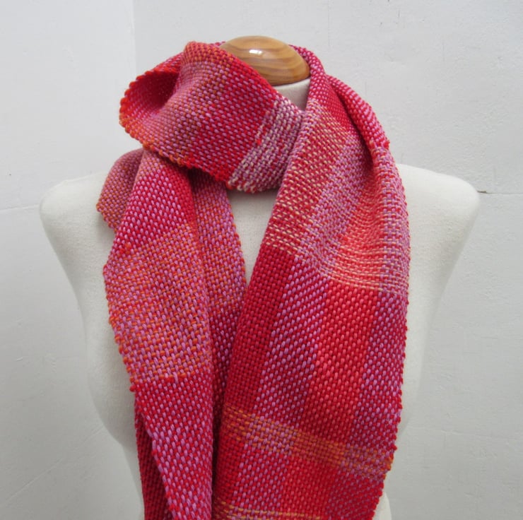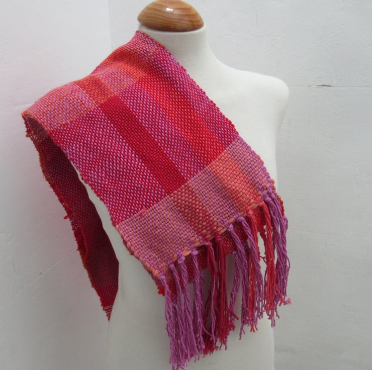 Hand woven from salvaged and scrap fibres in shades of pink and orange. Yarns used are a mix of natural and artificial fibres, blended to give a warm and eyecatching scarf.
